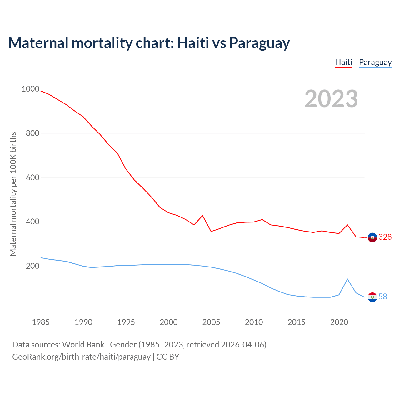 The maternal mortality rate, which is the probability of dying during childbirth or within 42 days of pregnancy termination, is 328 deaths per 100,000 live births in Haiti, compared to 58 deaths in Paraguay.