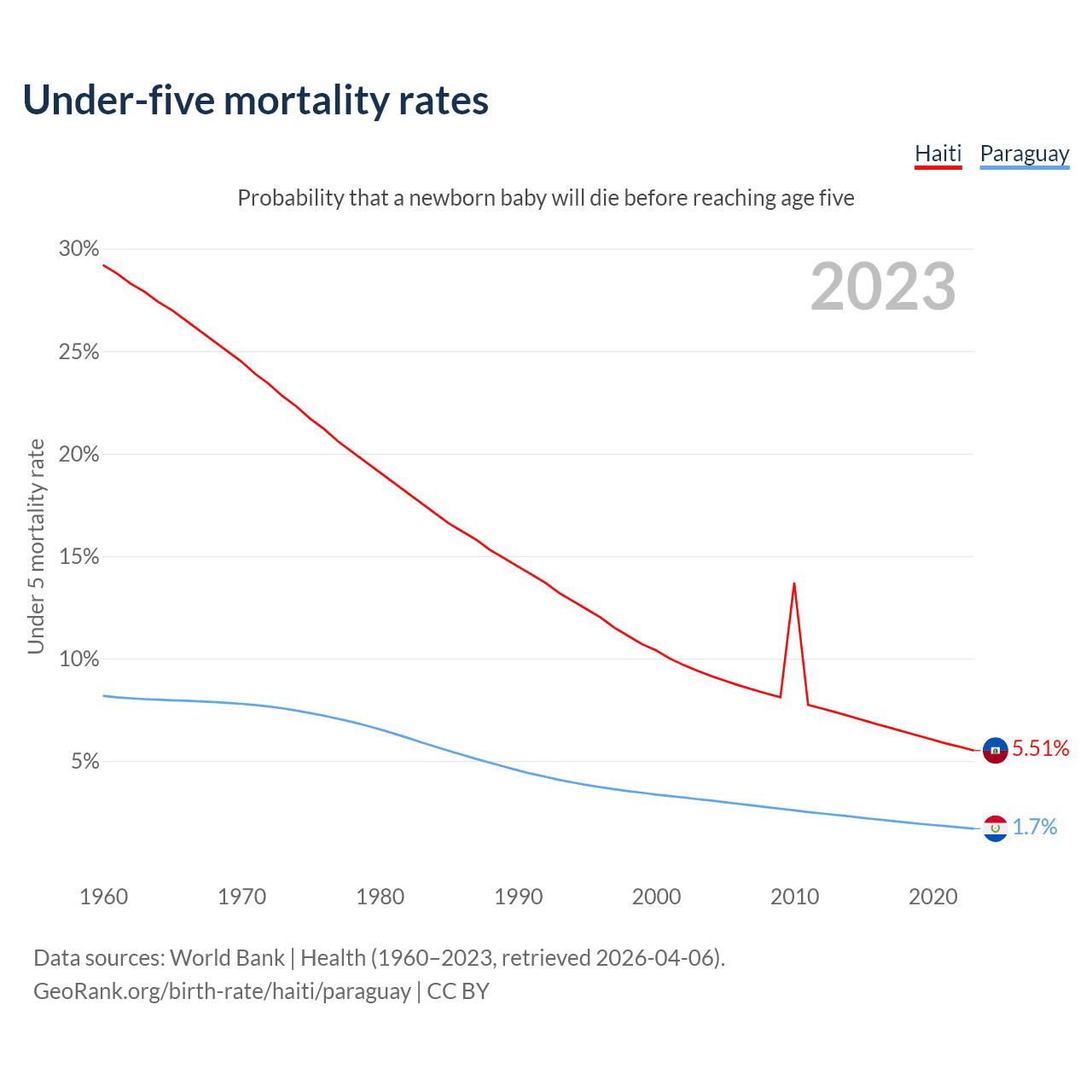 The chance that a newborn baby will die before reaching age five is 5.51% in Haiti and 1.7% in Paraguay. Above is a chart with historical data on under-five mortality rates.