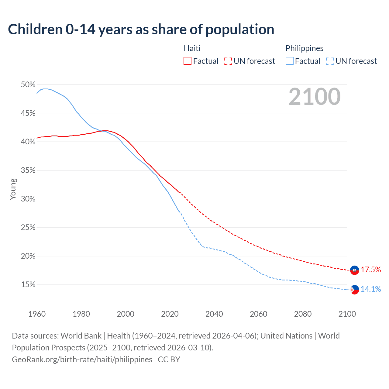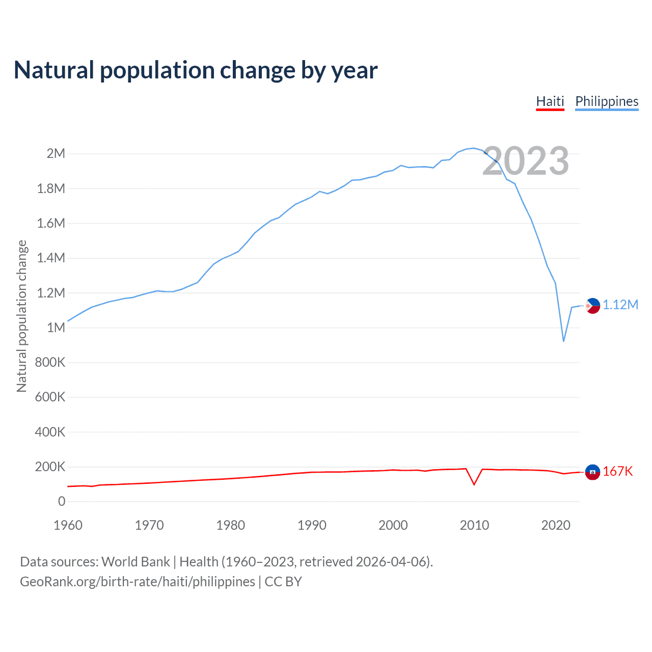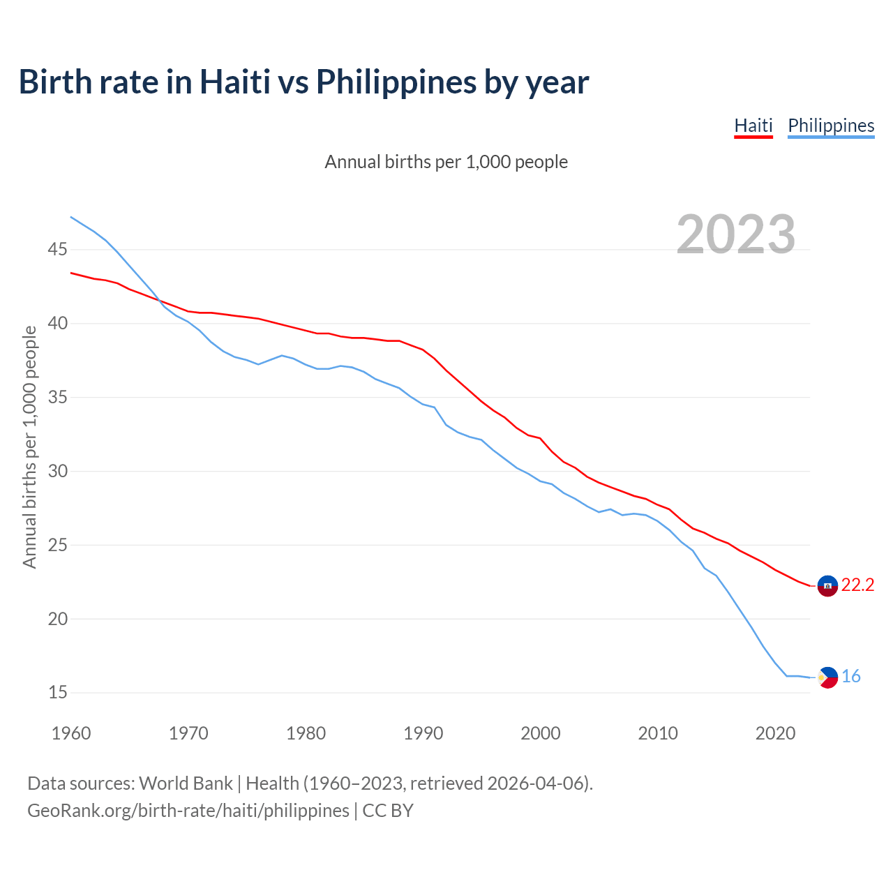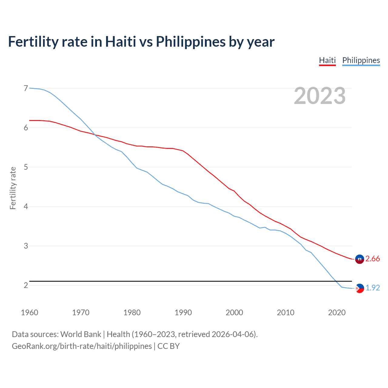 According to the latest available data on birth rates, the fertility rate in Haiti was 2.66 children per woman in 2023, compared to 1.92 in the Philippines in 2023. The replacement level is considered to be 2.1 children per woman.