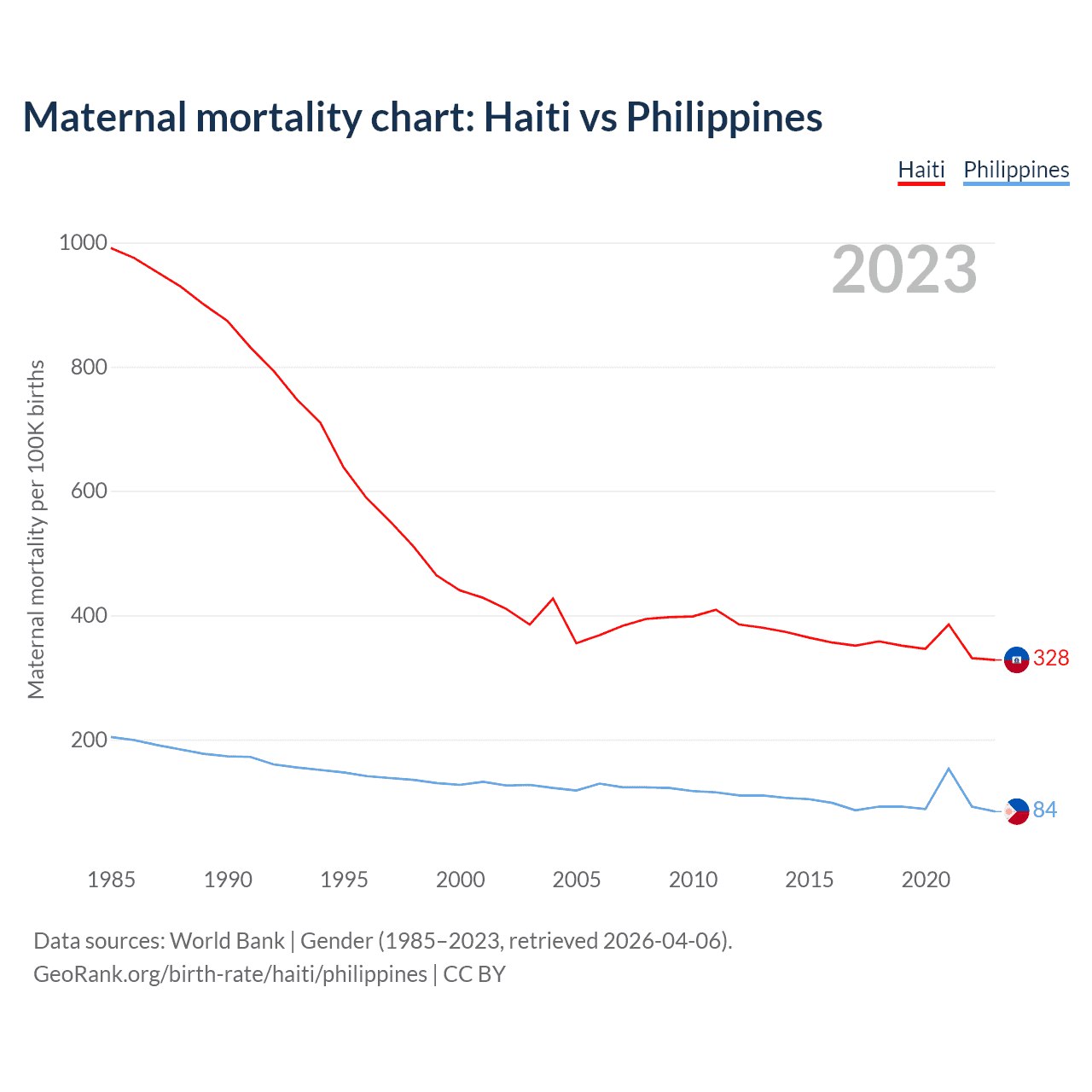 The maternal mortality rate, which is the probability of dying during childbirth or within 42 days of pregnancy termination, is 328 deaths per 100,000 live births in Haiti, compared to 84 deaths in the Philippines.