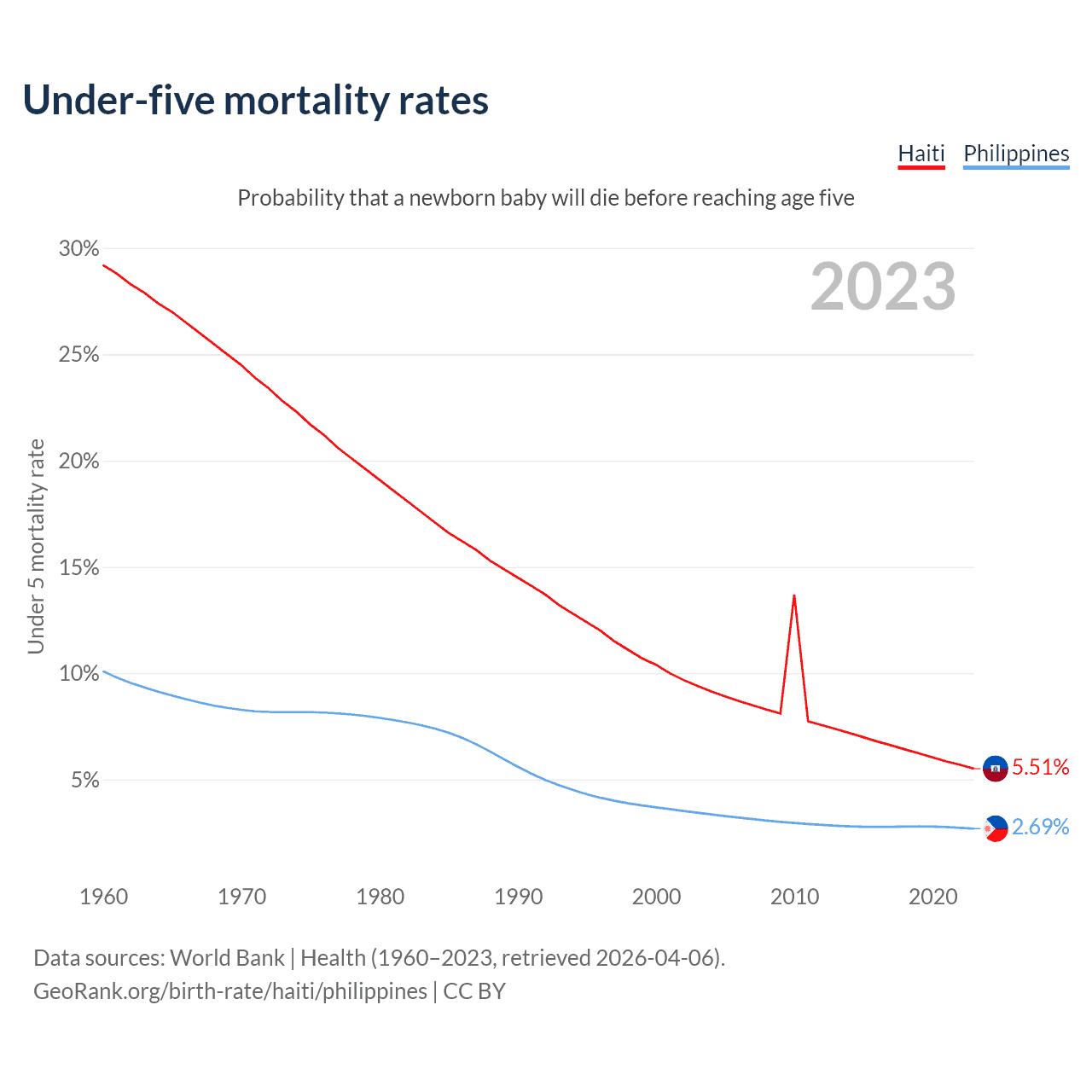 The chance that a newborn baby will die before reaching age five is 5.51% in Haiti and 2.69% in the Philippines. Above is a chart with historical data on under-five mortality rates.