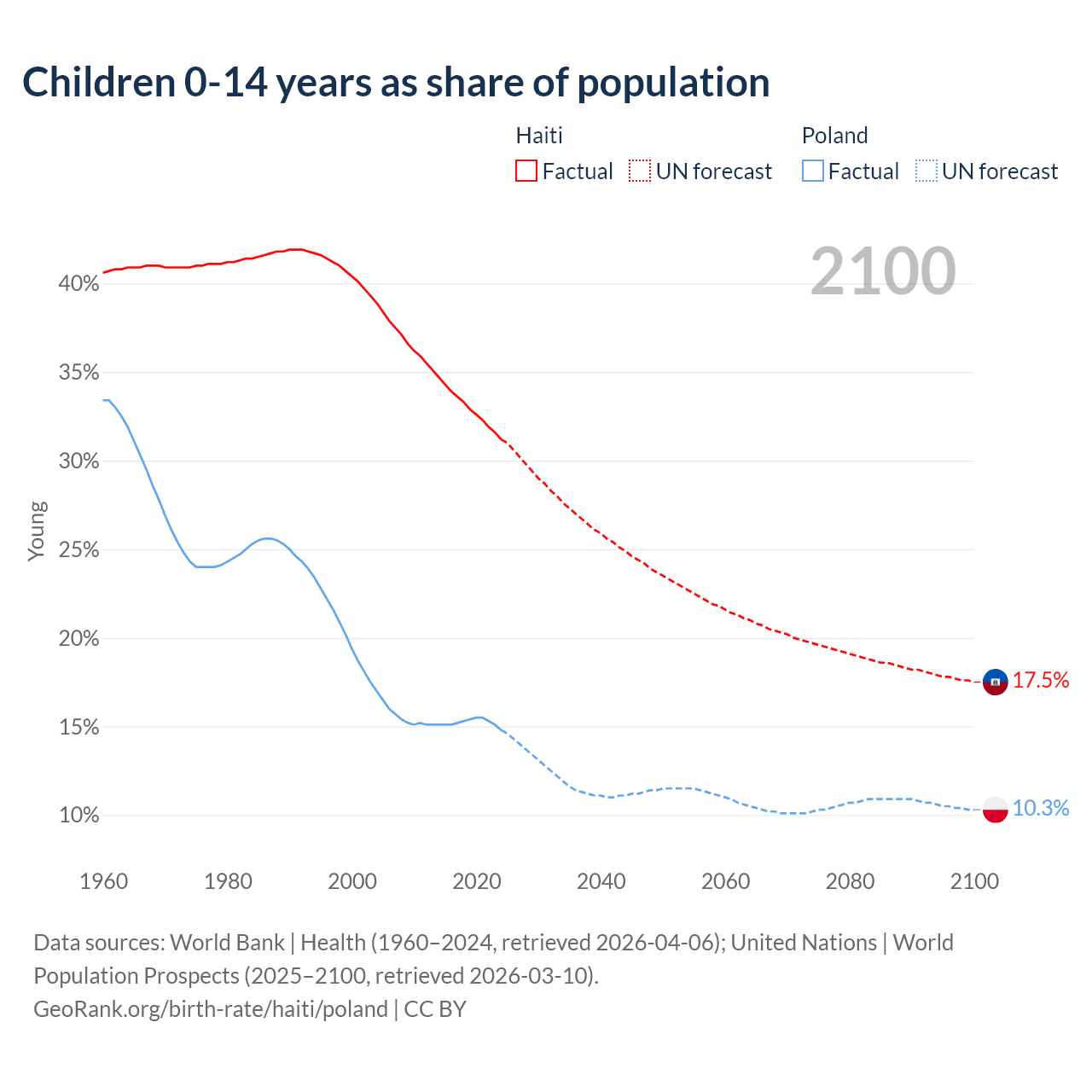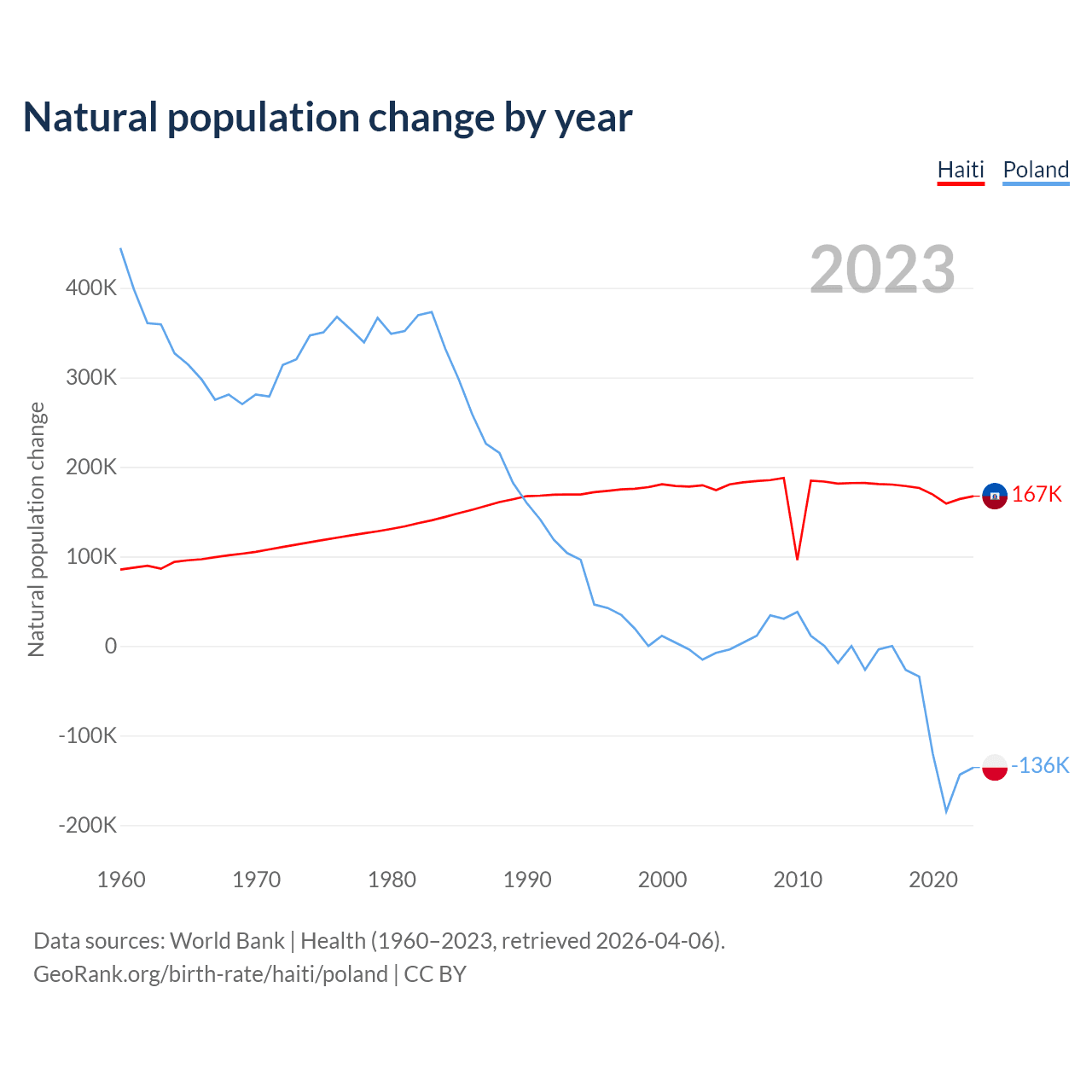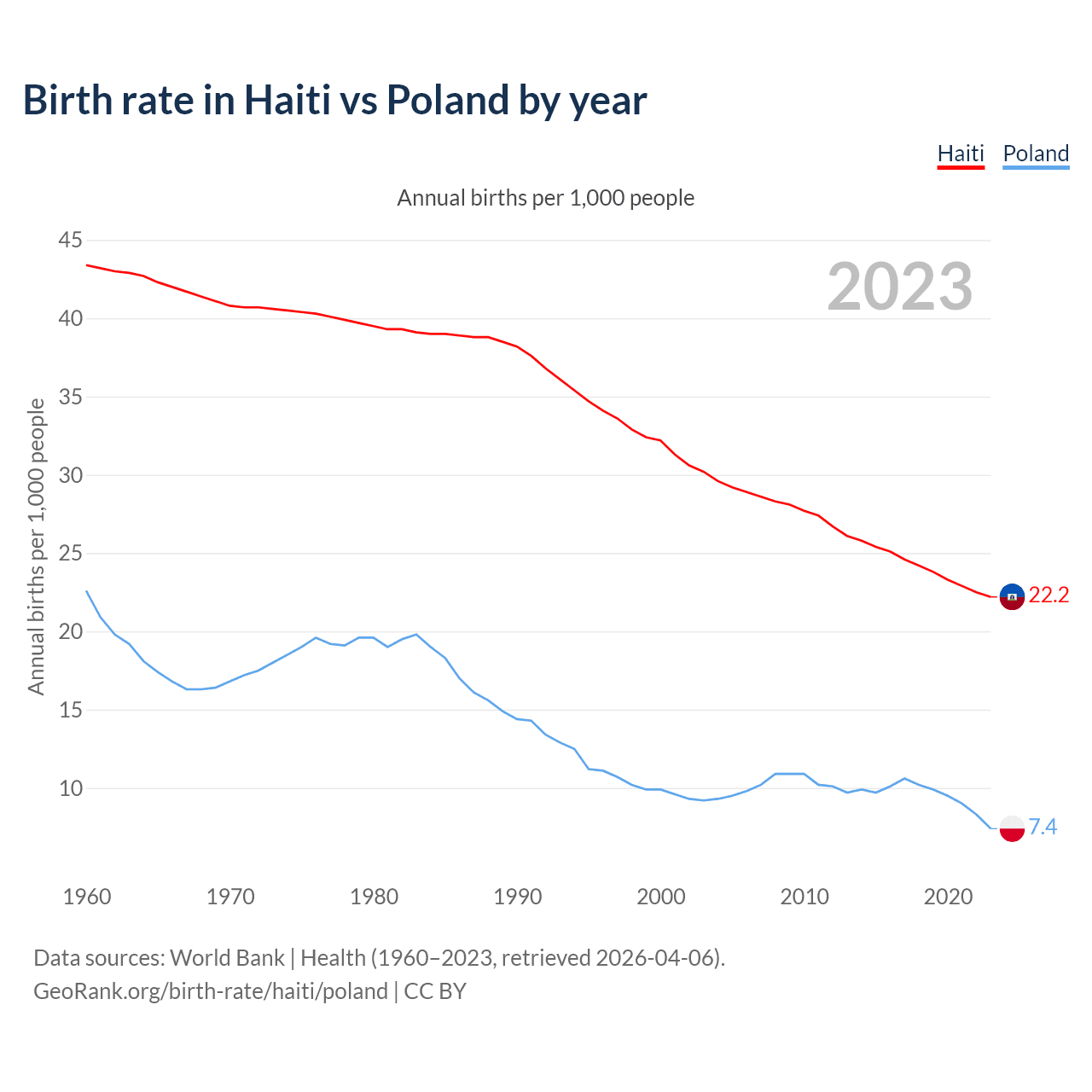 Haiti has an annual birth rate of 22.2 births per 1,000 people, compared to 7.4 for Poland. The average number of children a woman is expected to have during her lifetime — the fertility rate, is 2.66 in Haiti and 1.16 in Poland — 56.4% difference.