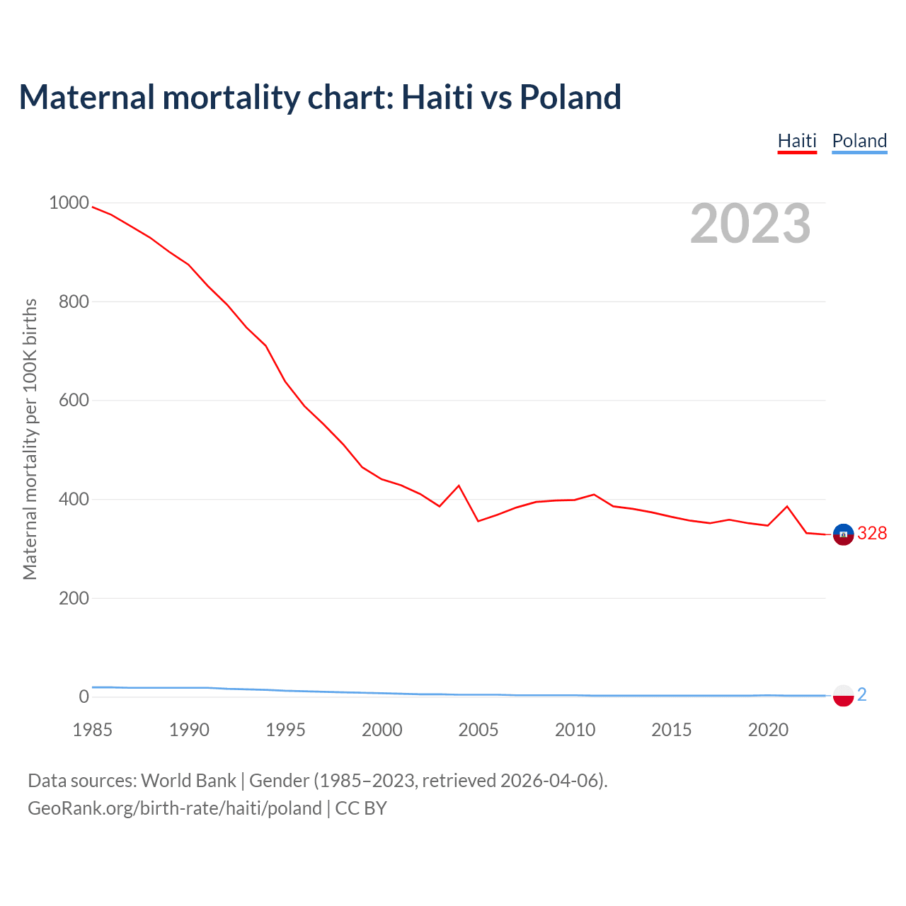 The maternal mortality rate, which is the probability of dying during childbirth or within 42 days of pregnancy termination, is 328 deaths per 100,000 live births in Haiti, compared to 2 deaths in Poland.