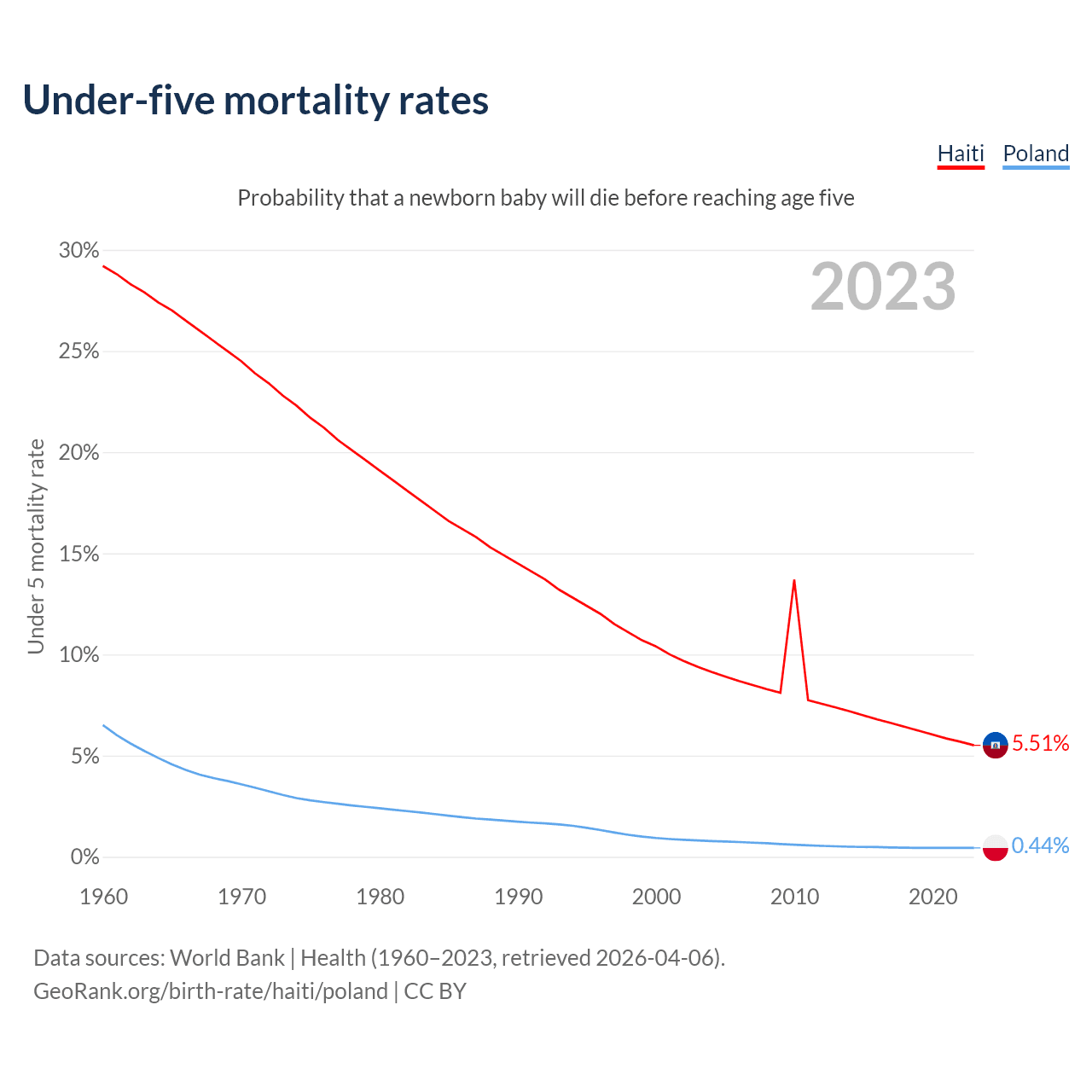 The chance that a newborn baby will die before reaching age five is 5.51% in Haiti and 0.44% in Poland. Above is a chart with historical data on under-five mortality rates.