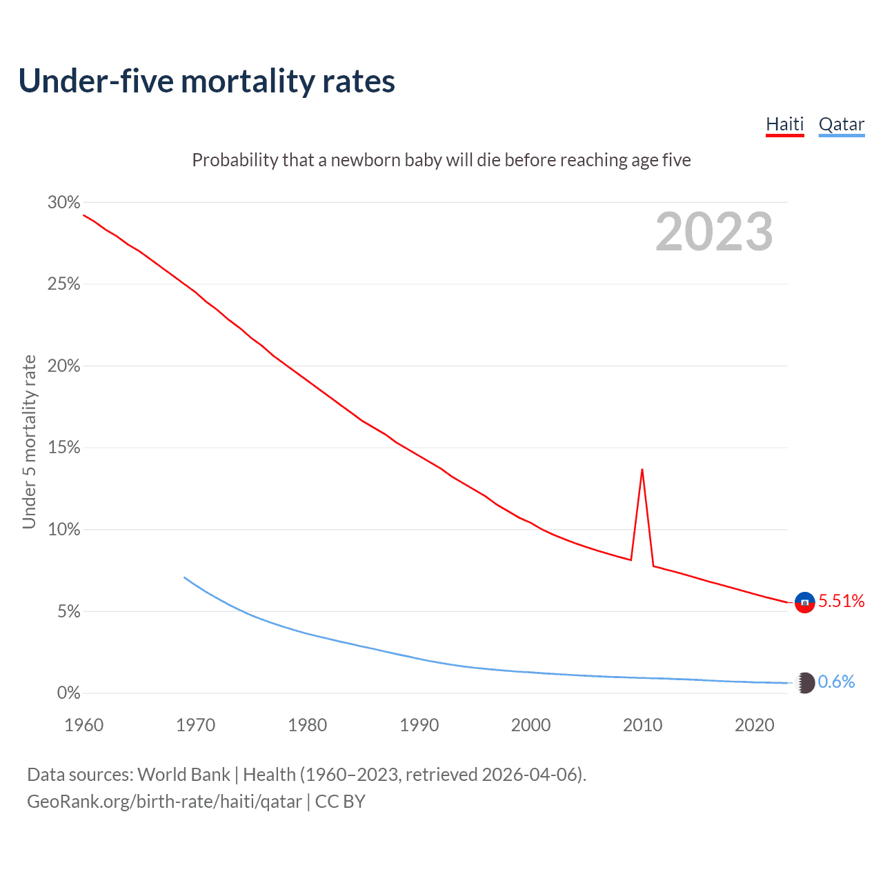 The chance that a newborn baby will die before reaching age five is 5.51% in Haiti and 0.6% in Qatar. Above is a chart with historical data on under-five mortality rates.