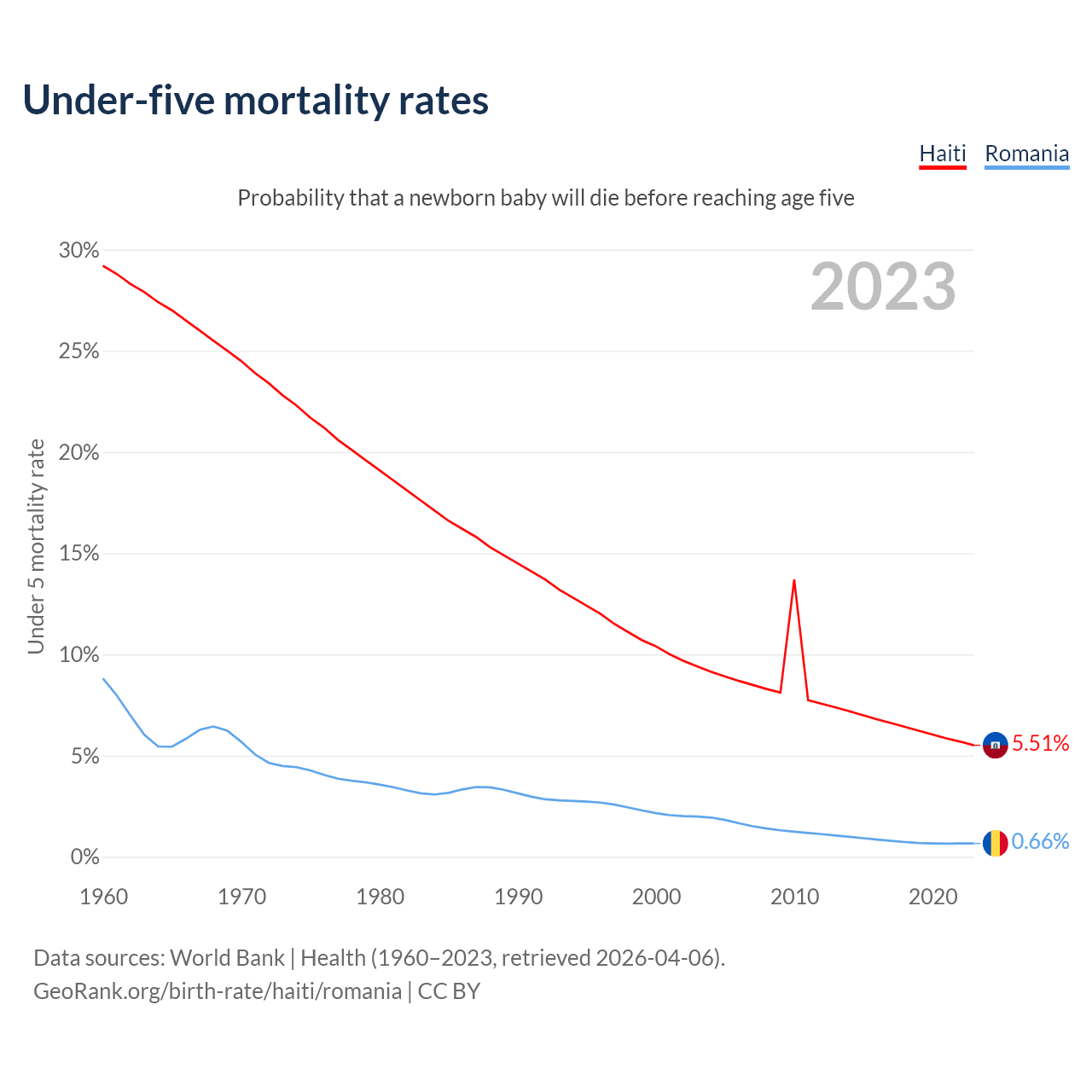The chance that a newborn baby will die before reaching age five is 5.51% in Haiti and 0.66% in Romania. Above is a chart with historical data on under-five mortality rates.