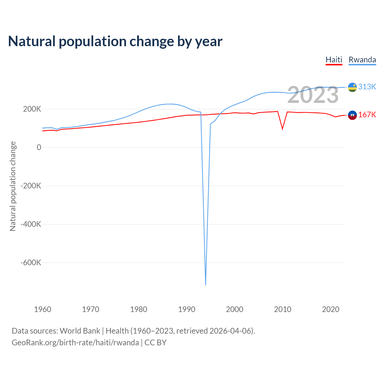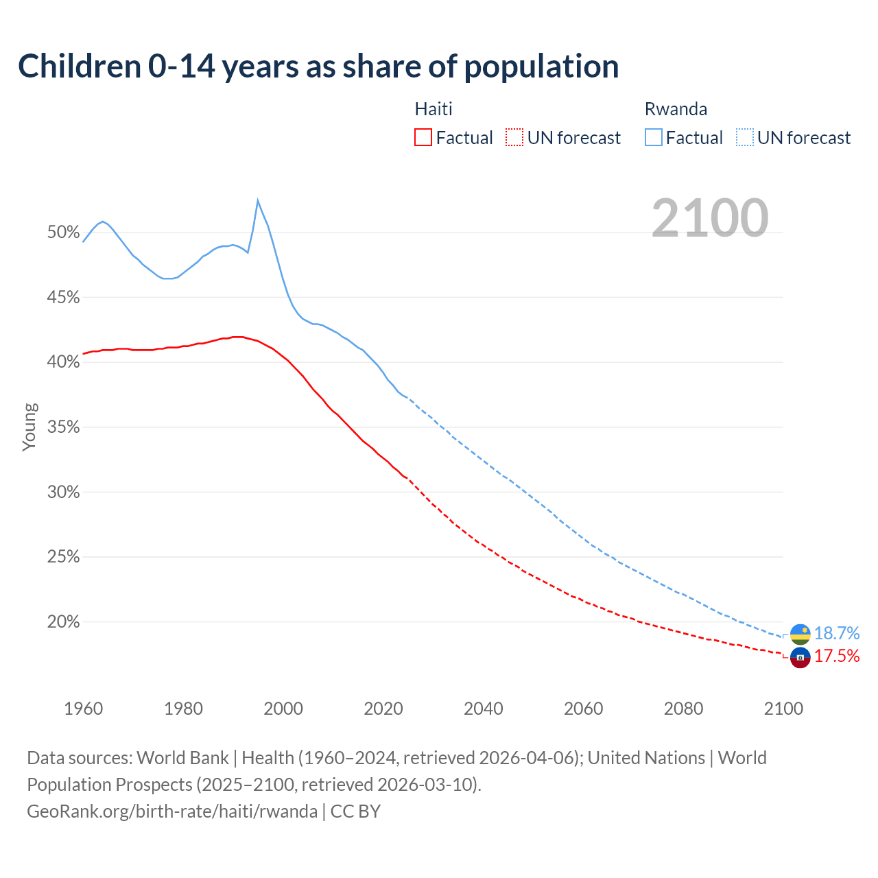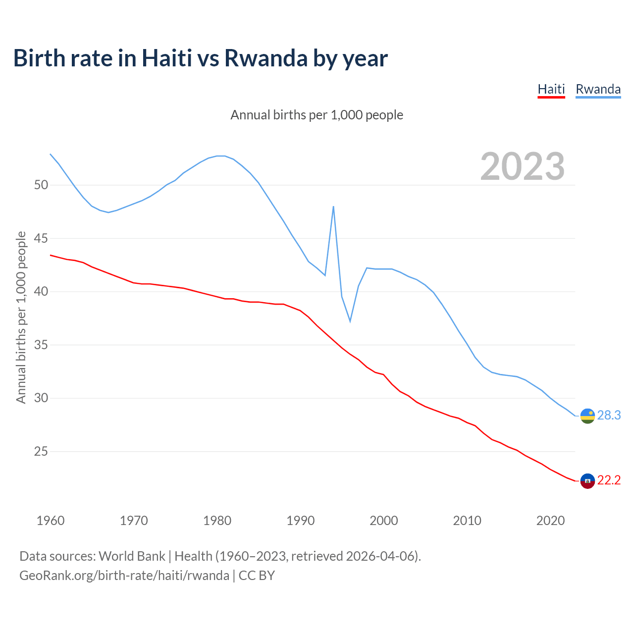 According to the latest available data on birth rates, the fertility rate in Haiti was 2.66 children per woman in 2023, compared to 3.7 in Rwanda in 2023. The replacement level is considered to be 2.1 children per woman.