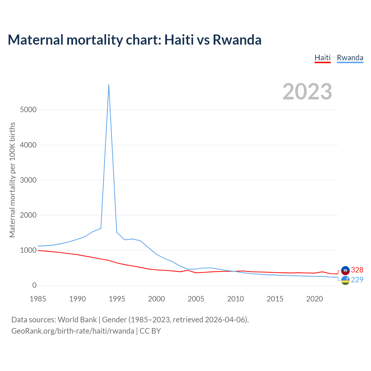 The maternal mortality rate, which is the probability of dying during childbirth or within 42 days of pregnancy termination, is 328 deaths per 100,000 live births in Haiti, compared to 229 deaths in Rwanda.