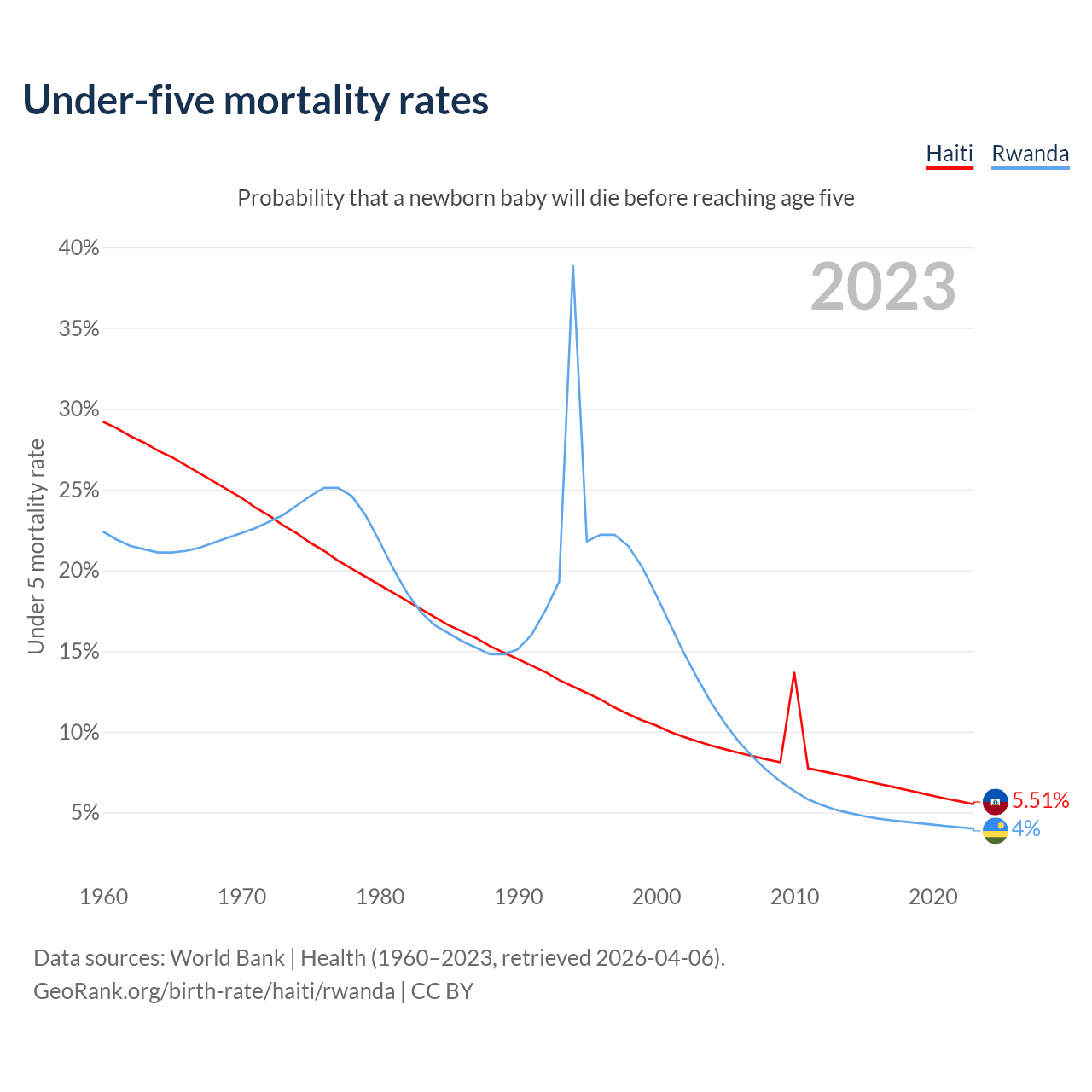 The chance that a newborn baby will die before reaching age five is 5.51% in Haiti and 4% in Rwanda. Above is a chart with historical data on under-five mortality rates.