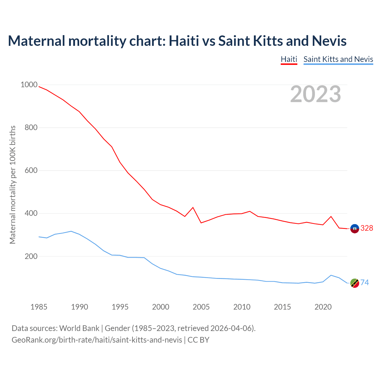 The maternal mortality rate, which is the probability of dying during childbirth or within 42 days of pregnancy termination, is 328 deaths per 100,000 live births in Haiti, compared to 74 deaths in Saint Kitts and Nevis.