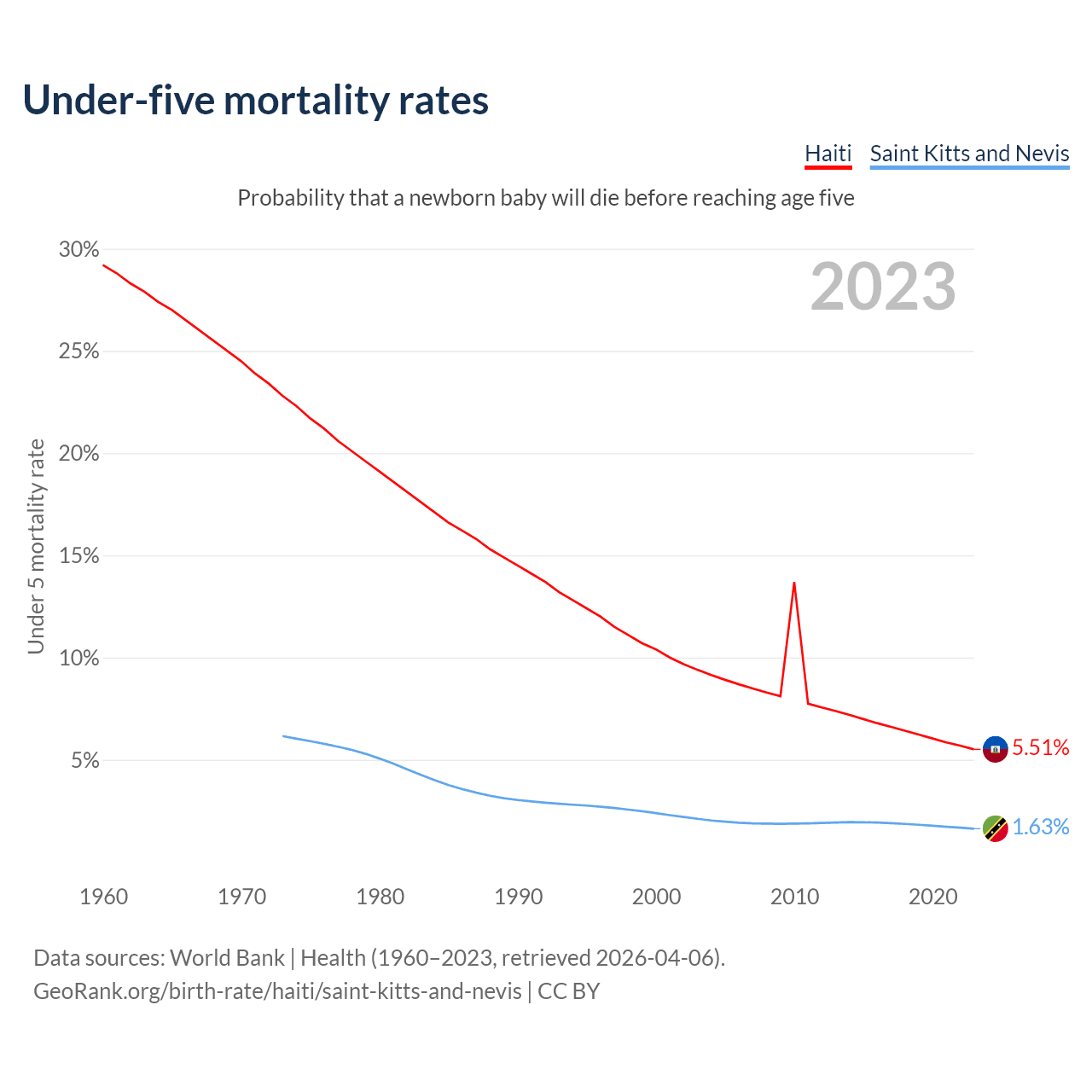 The chance that a newborn baby will die before reaching age five is 5.51% in Haiti and 1.63% in Saint Kitts and Nevis. Above is a chart with historical data on under-five mortality rates.