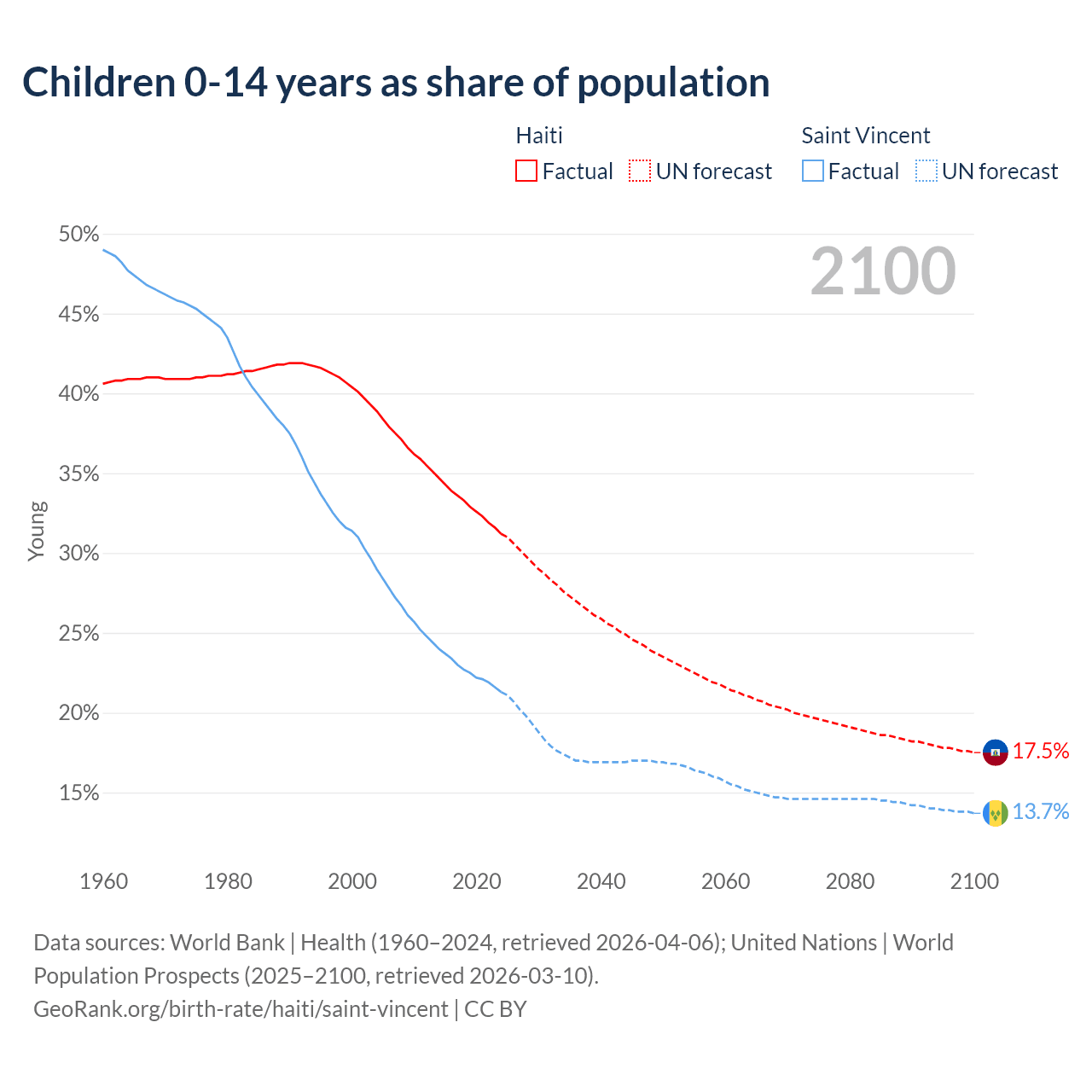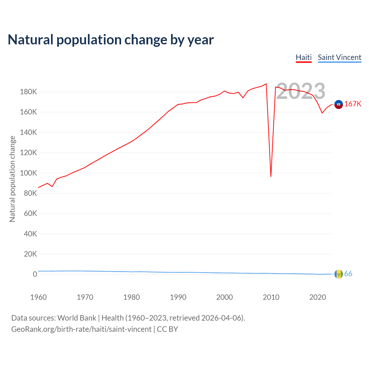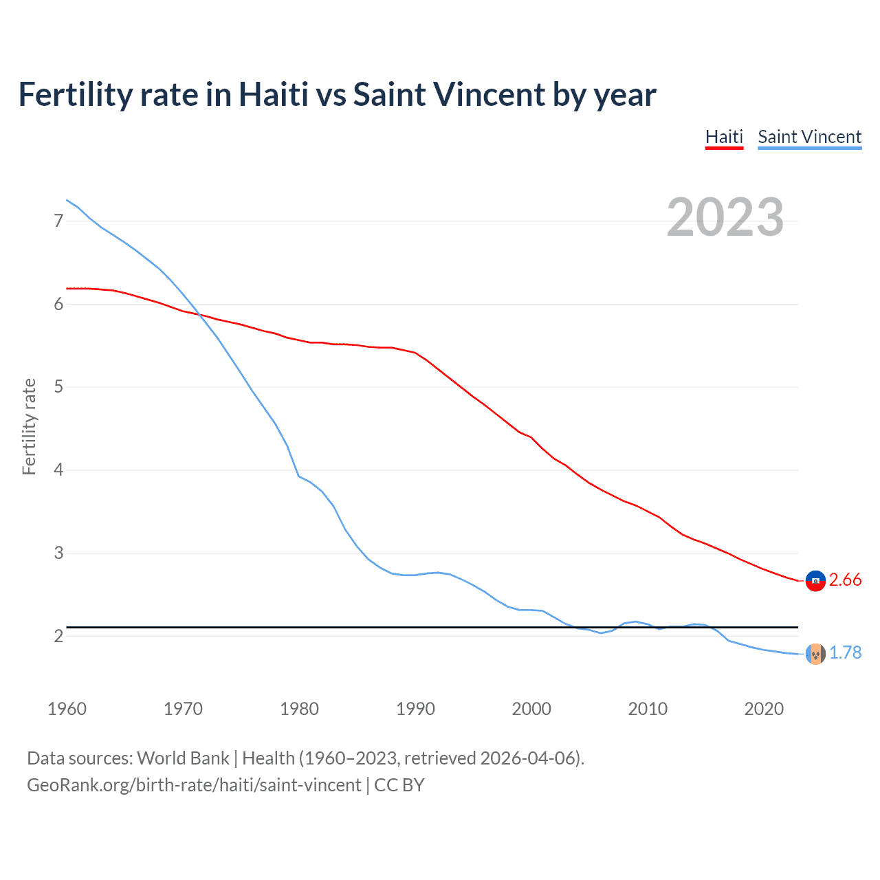 According to the latest available data on birth rates, the fertility rate in Haiti was 2.66 children per woman in 2023, compared to 1.78 in Saint Vincent in 2023. The replacement level is considered to be 2.1 children per woman.