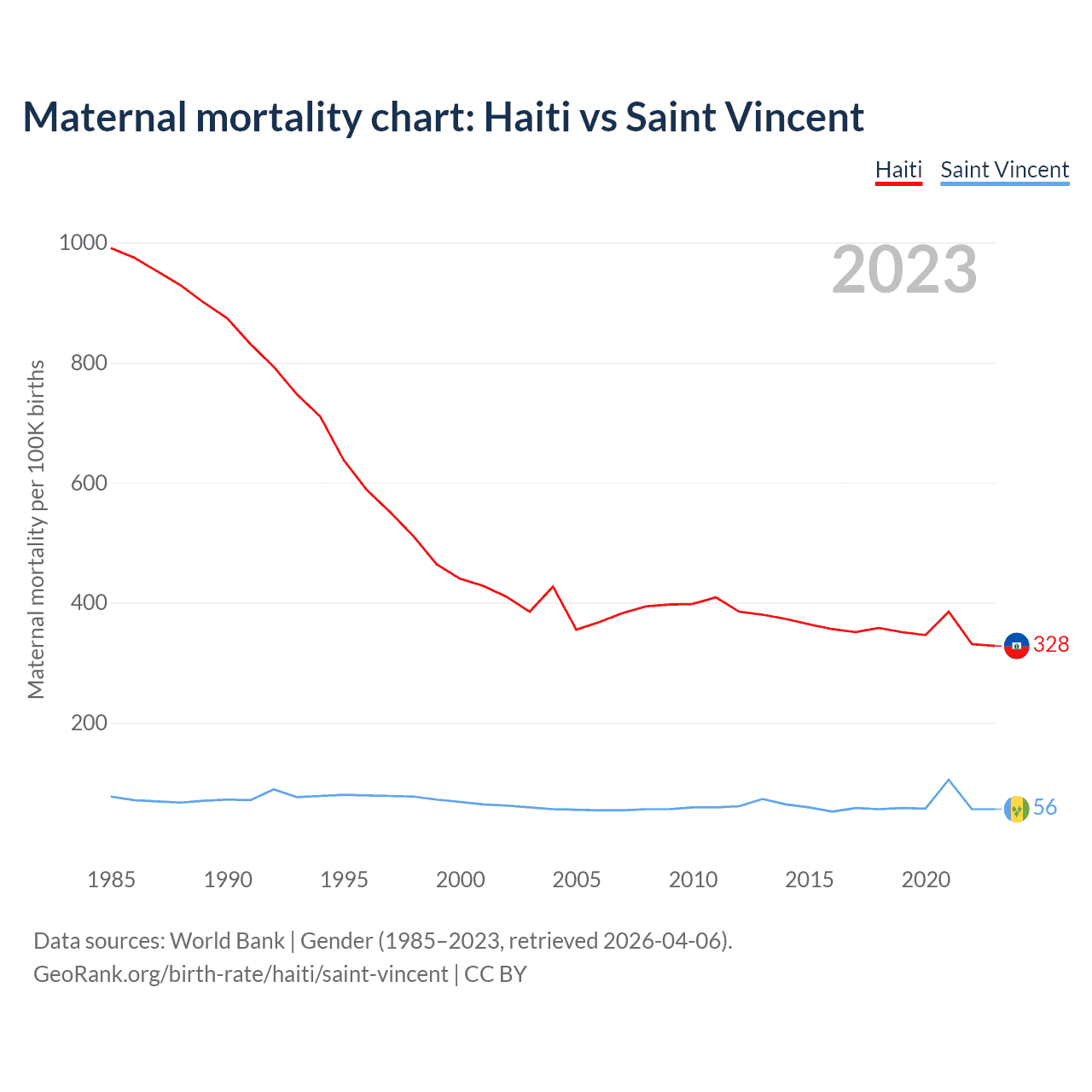 The maternal mortality rate, which is the probability of dying during childbirth or within 42 days of pregnancy termination, is 328 deaths per 100,000 live births in Haiti, compared to 56 deaths in Saint Vincent.