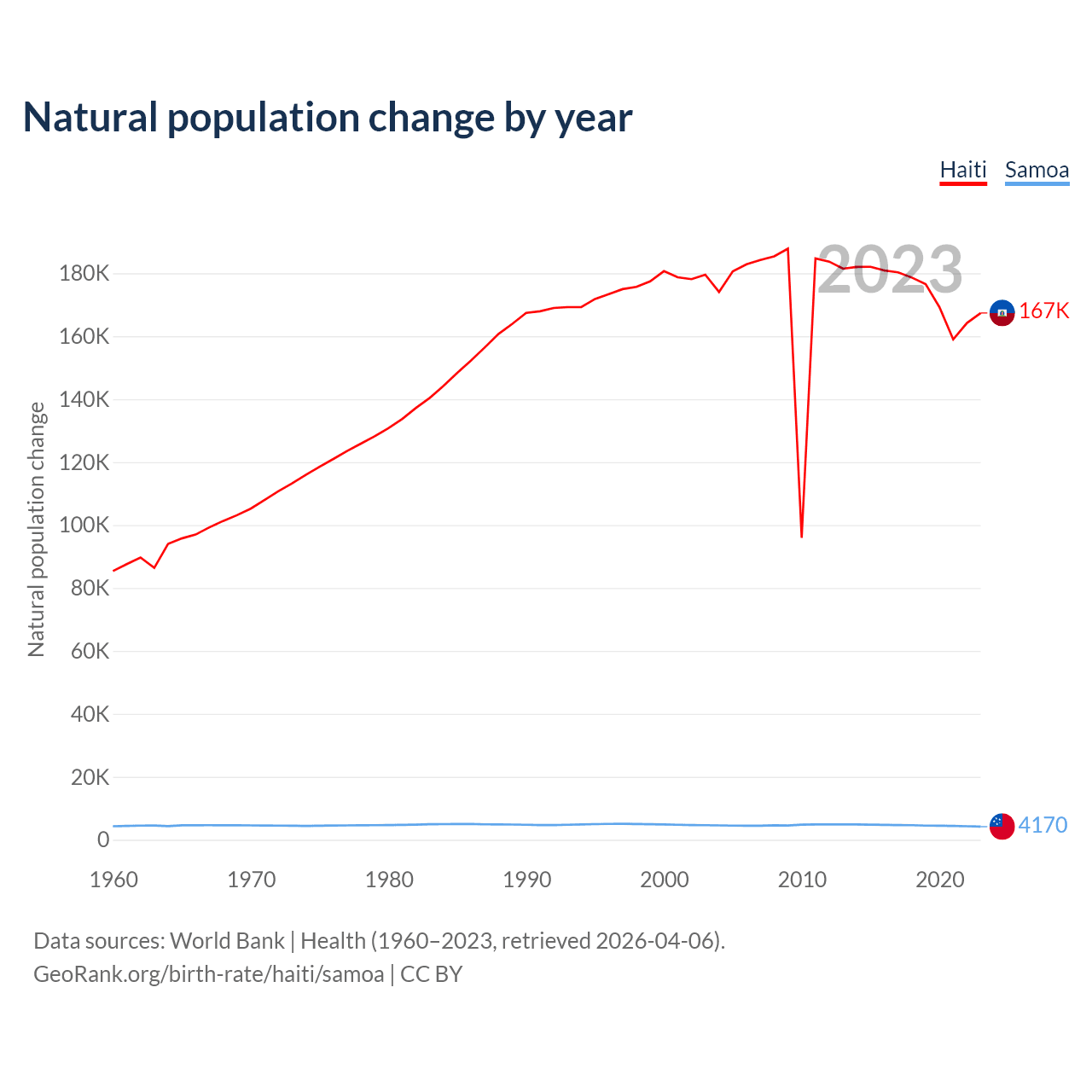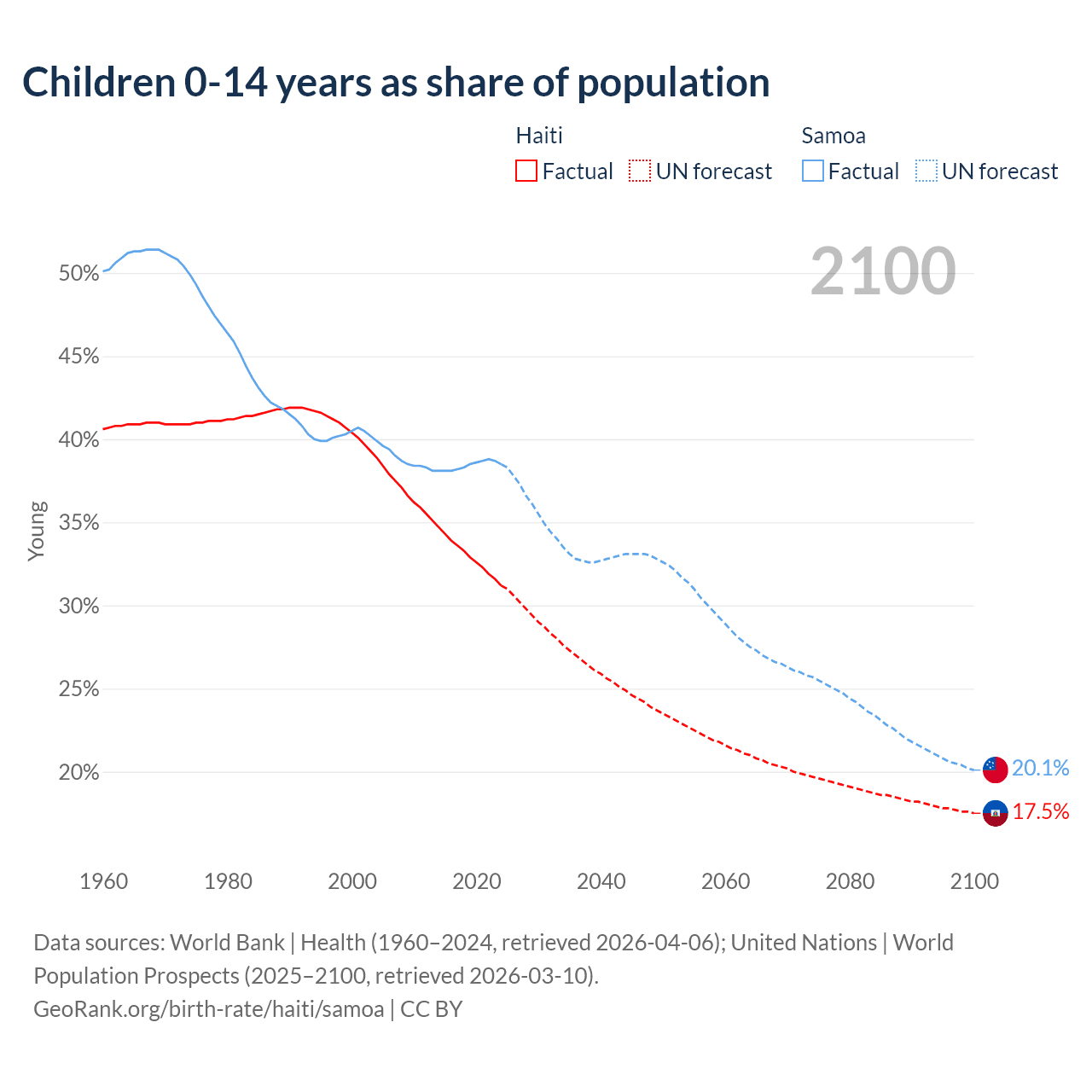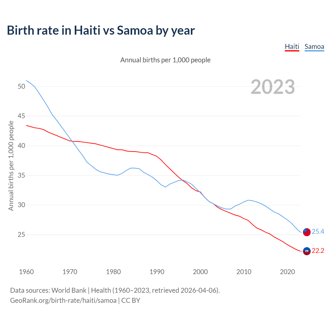 According to the latest available data on birth rates, the fertility rate in Haiti was 2.66 children per woman in 2023, compared to 3.83 in Samoa in 2023. The replacement level is considered to be 2.1 children per woman.