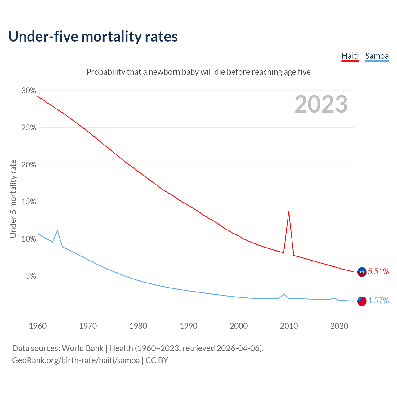 The chance that a newborn baby will die before reaching age five is 5.51% in Haiti and 1.57% in Samoa. Above is a chart with historical data on under-five mortality rates.