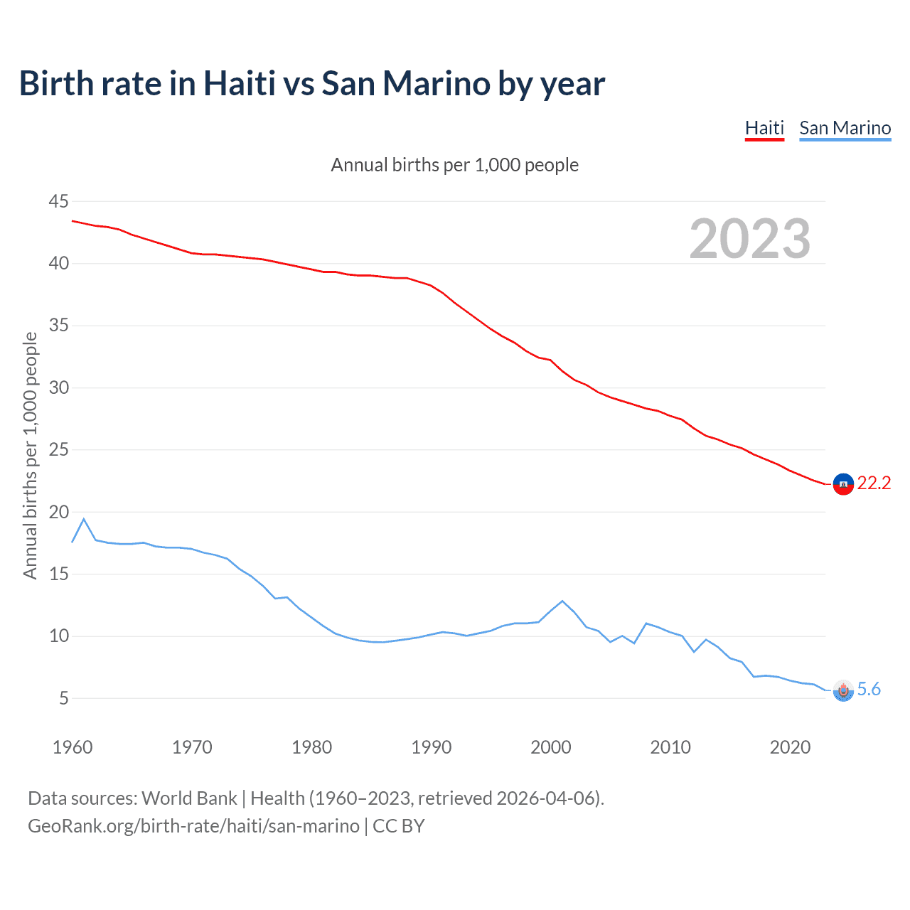 Haiti has an annual birth rate of 22.2 births per 1,000 people, compared to 5.6 for San Marino. The average number of children a woman is expected to have during her lifetime — the fertility rate, is 2.66 in Haiti and 1.15 in San Marino — 56.7% difference.