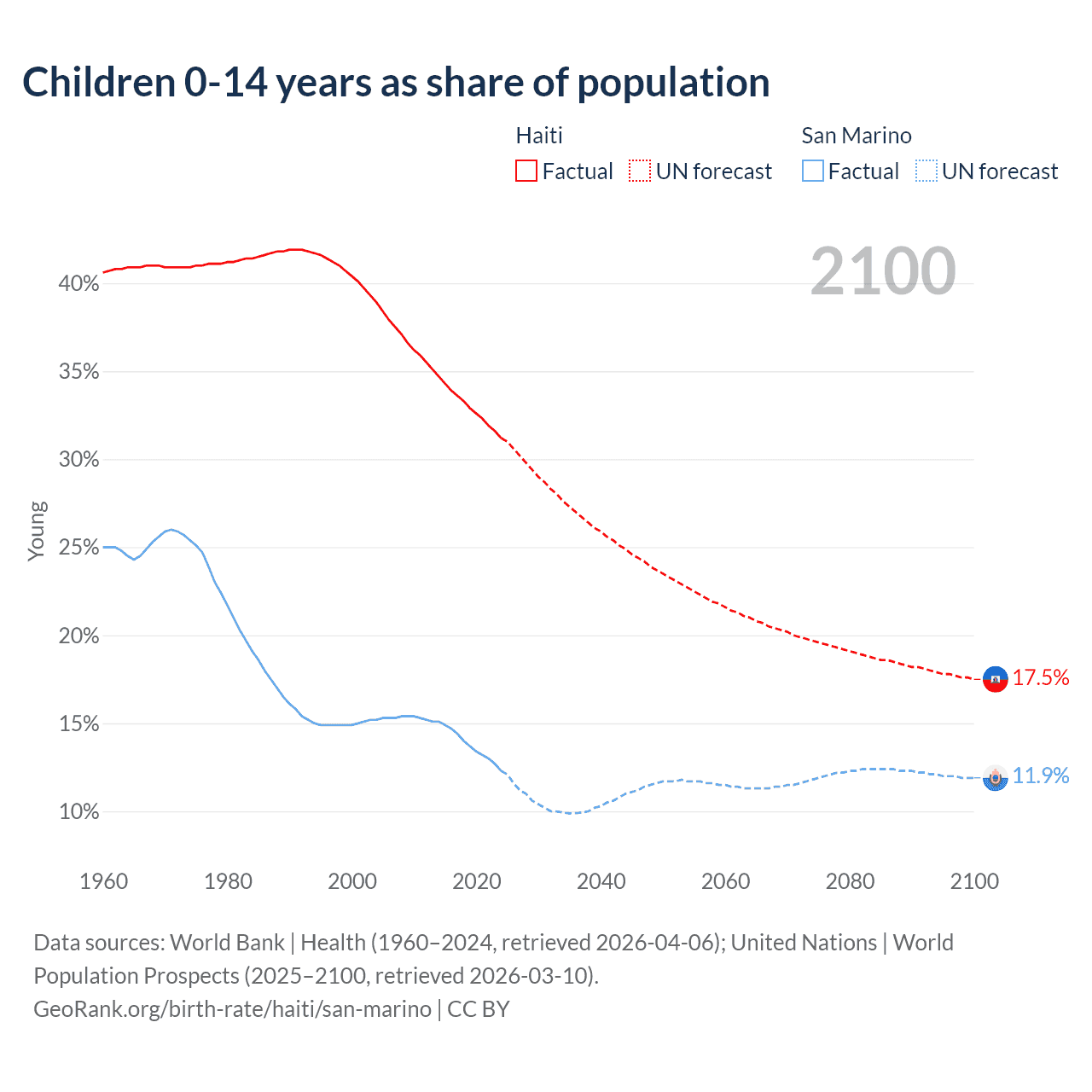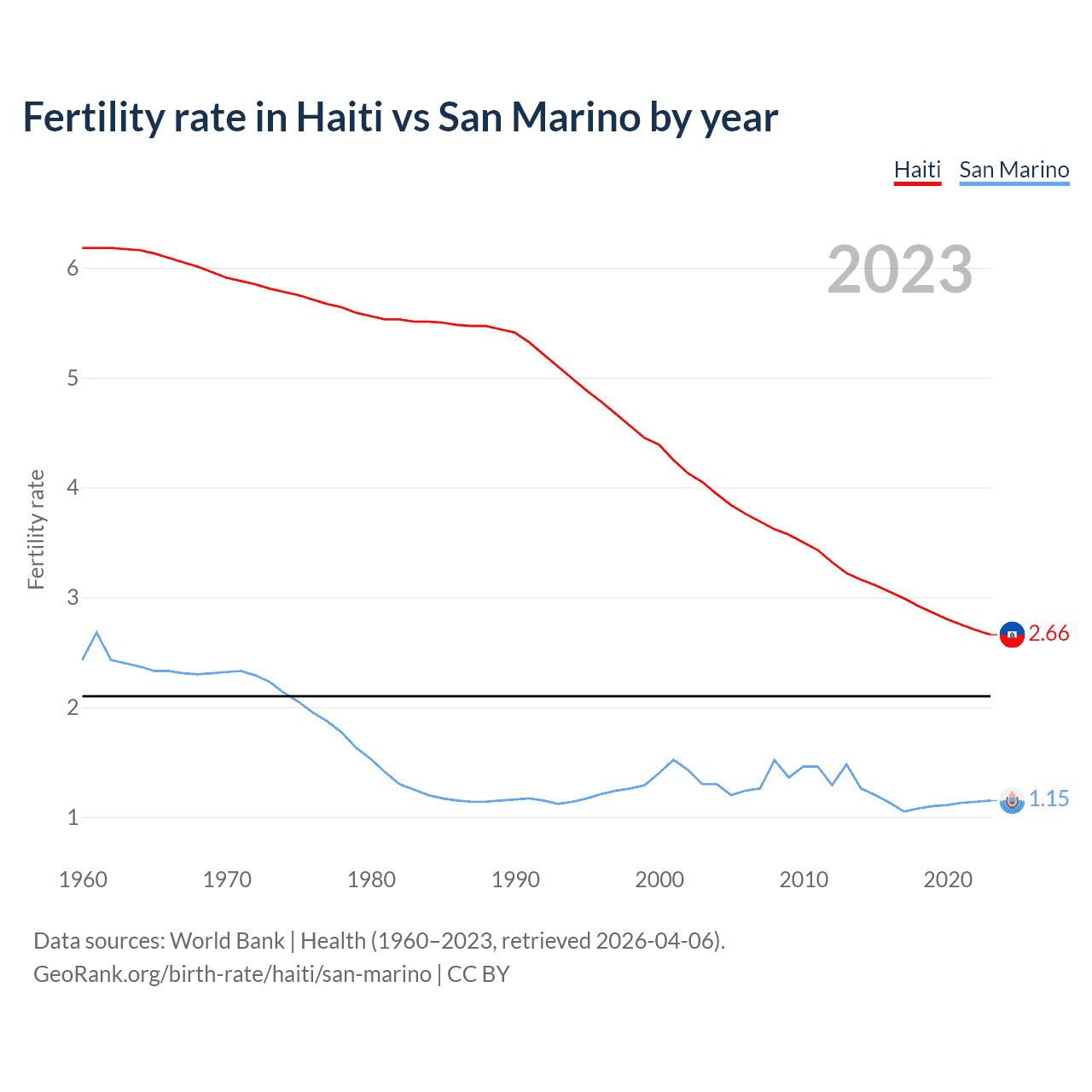 According to the latest available data on birth rates, the fertility rate in Haiti was 2.66 children per woman in 2023, compared to 1.15 in San Marino in 2023. The replacement level is considered to be 2.1 children per woman.