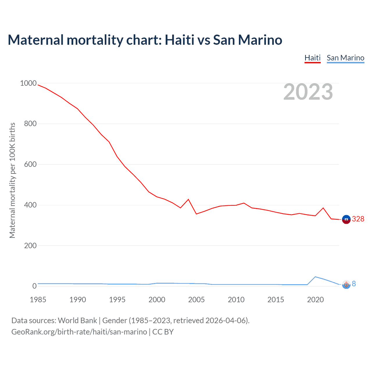 The maternal mortality rate, which is the probability of dying during childbirth or within 42 days of pregnancy termination, is 328 deaths per 100,000 live births in Haiti, compared to 8 deaths in San Marino.