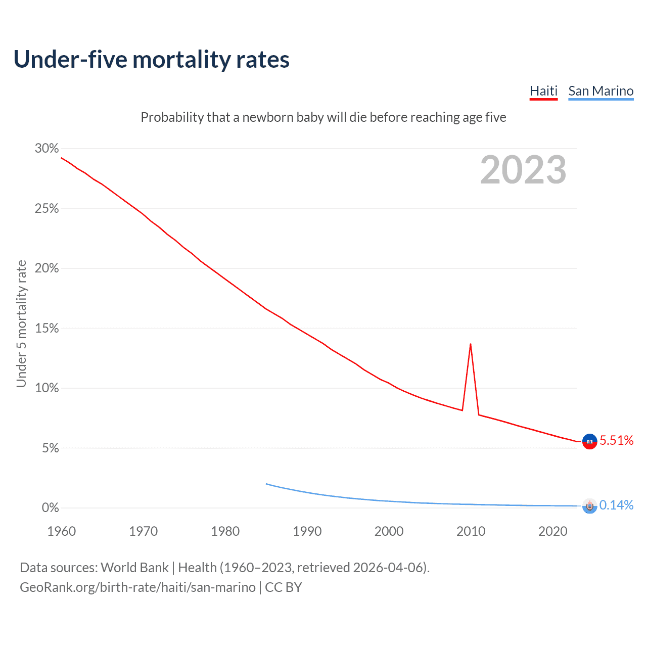 The chance that a newborn baby will die before reaching age five is 5.51% in Haiti and 0.14% in San Marino. Above is a chart with historical data on under-five mortality rates.