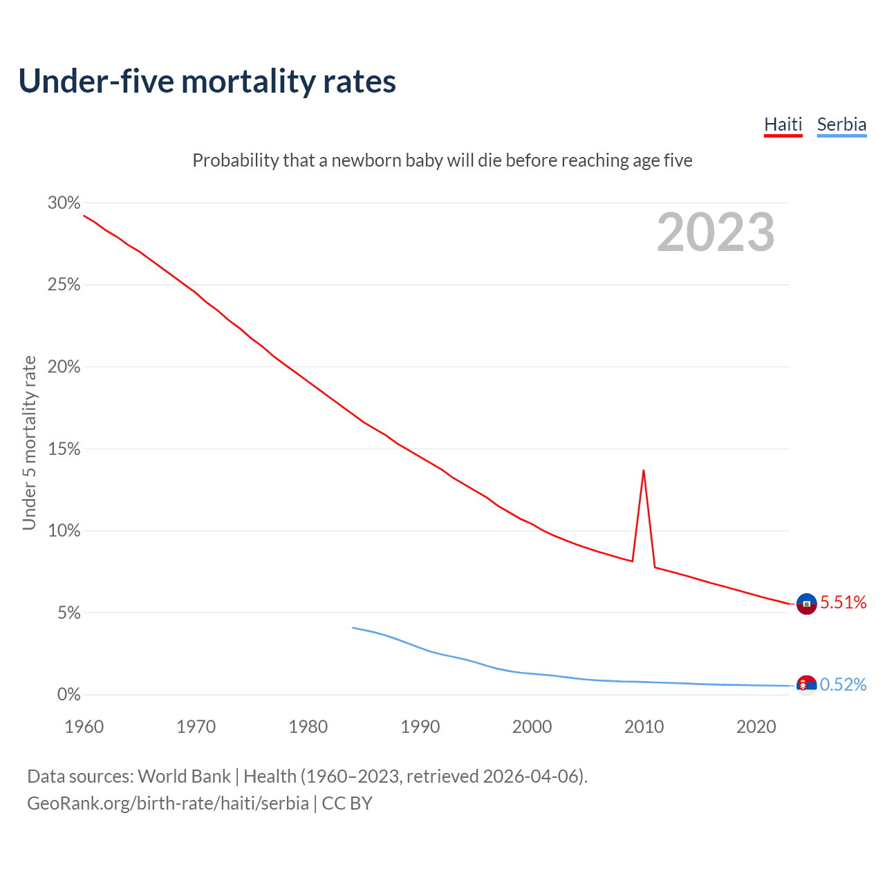 The chance that a newborn baby will die before reaching age five is 5.51% in Haiti and 0.52% in Serbia. Above is a chart with historical data on under-five mortality rates.