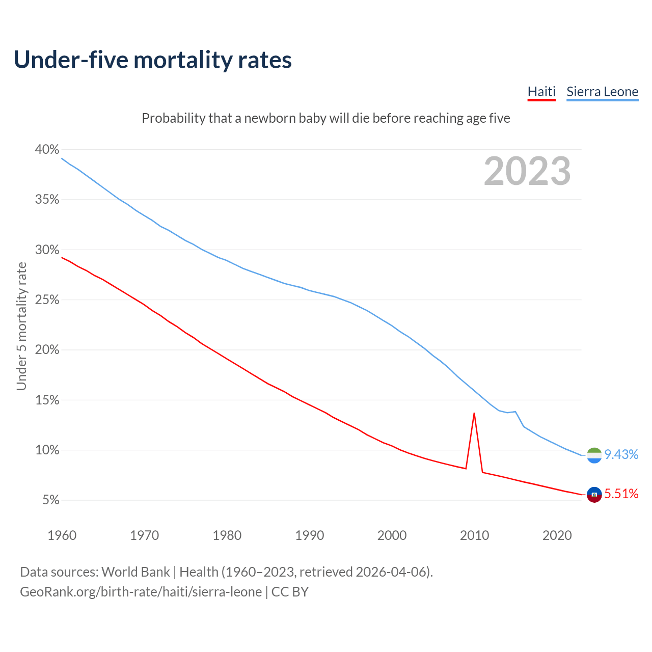 The chance that a newborn baby will die before reaching age five is 5.51% in Haiti and 9.43% in Sierra Leone. Above is a chart with historical data on under-five mortality rates.