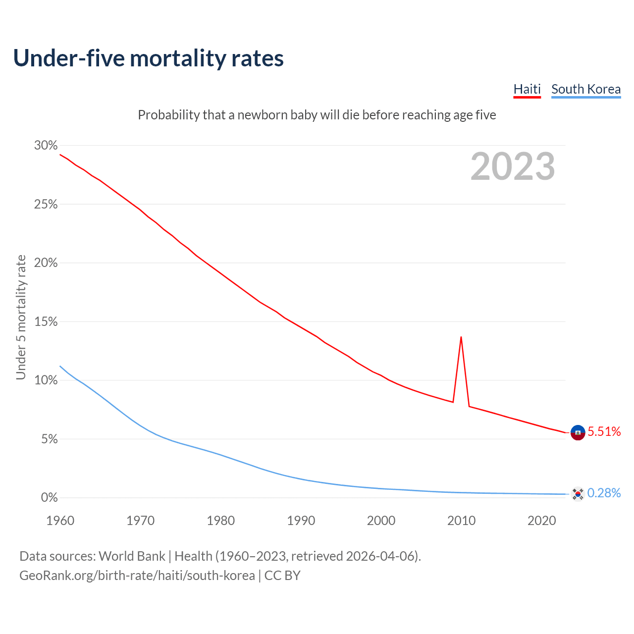 The chance that a newborn baby will die before reaching age five is 5.51% in Haiti and 0.28% in South Korea. Above is a chart with historical data on under-five mortality rates.