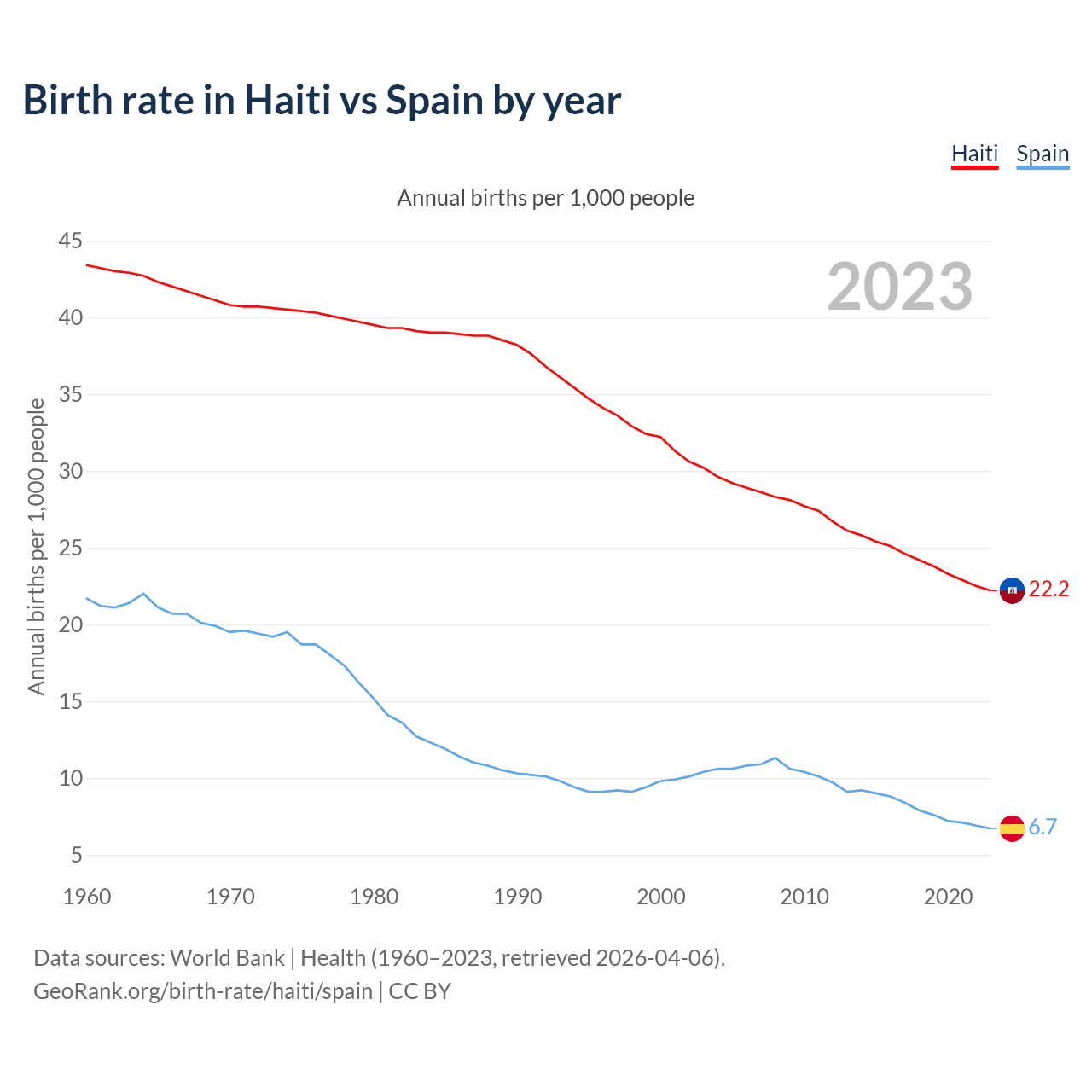 Haiti has an annual birth rate of 22.2 births per 1,000 people, compared to 6.7 for Spain. The average number of children a woman is expected to have during her lifetime — the fertility rate, is 2.66 in Haiti and 1.12 in Spain — 57.8% difference.
