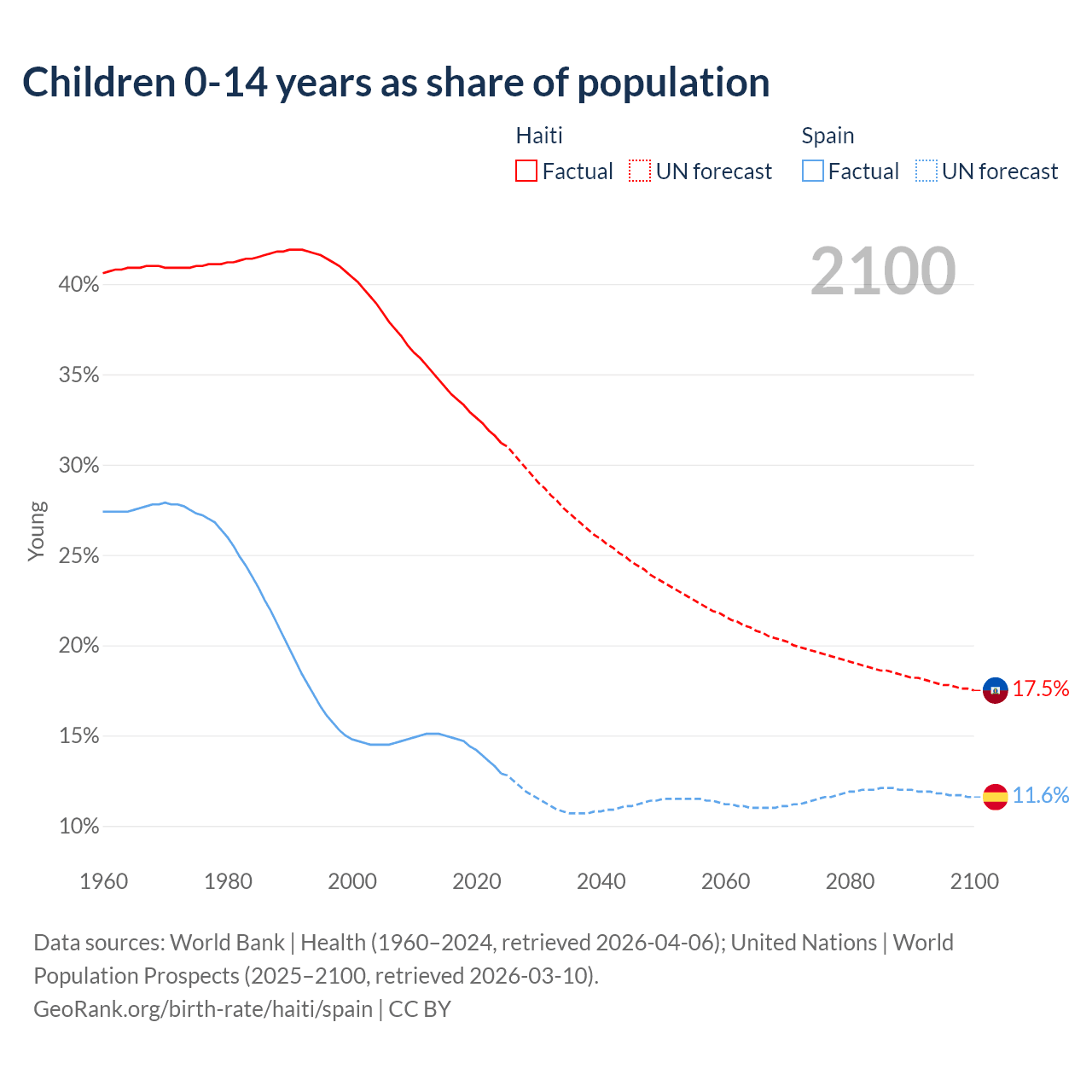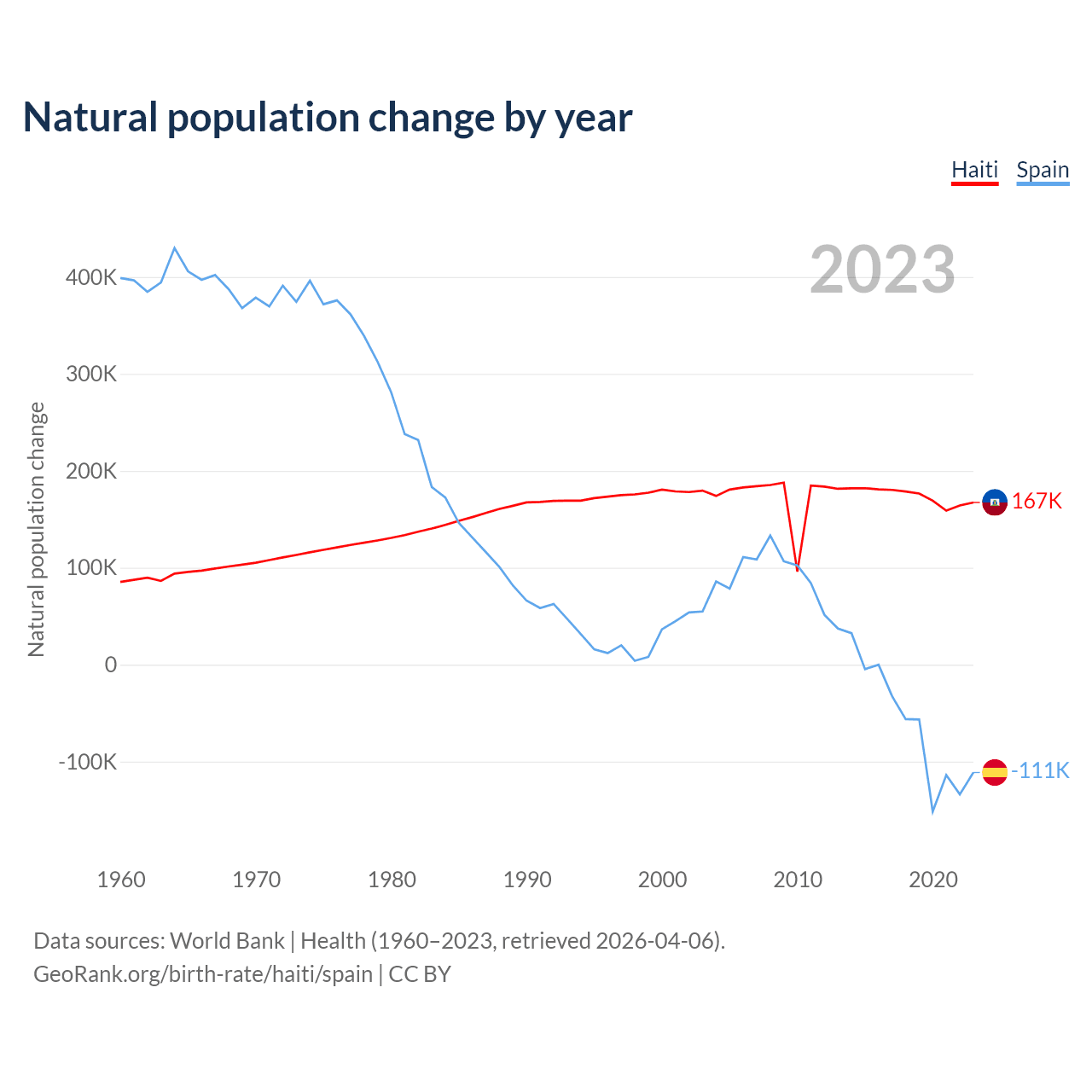 According to the latest available data on birth rates, the fertility rate in Haiti was 2.66 children per woman in 2023, compared to 1.12 in Spain in 2023. The replacement level is considered to be 2.1 children per woman.