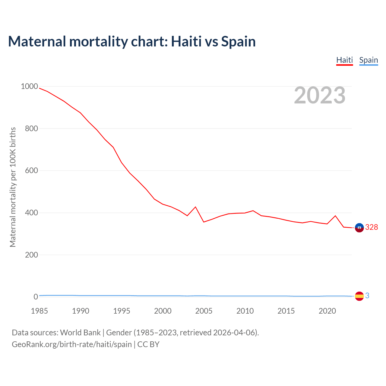 The maternal mortality rate, which is the probability of dying during childbirth or within 42 days of pregnancy termination, is 328 deaths per 100,000 live births in Haiti, compared to 3 deaths in Spain.
