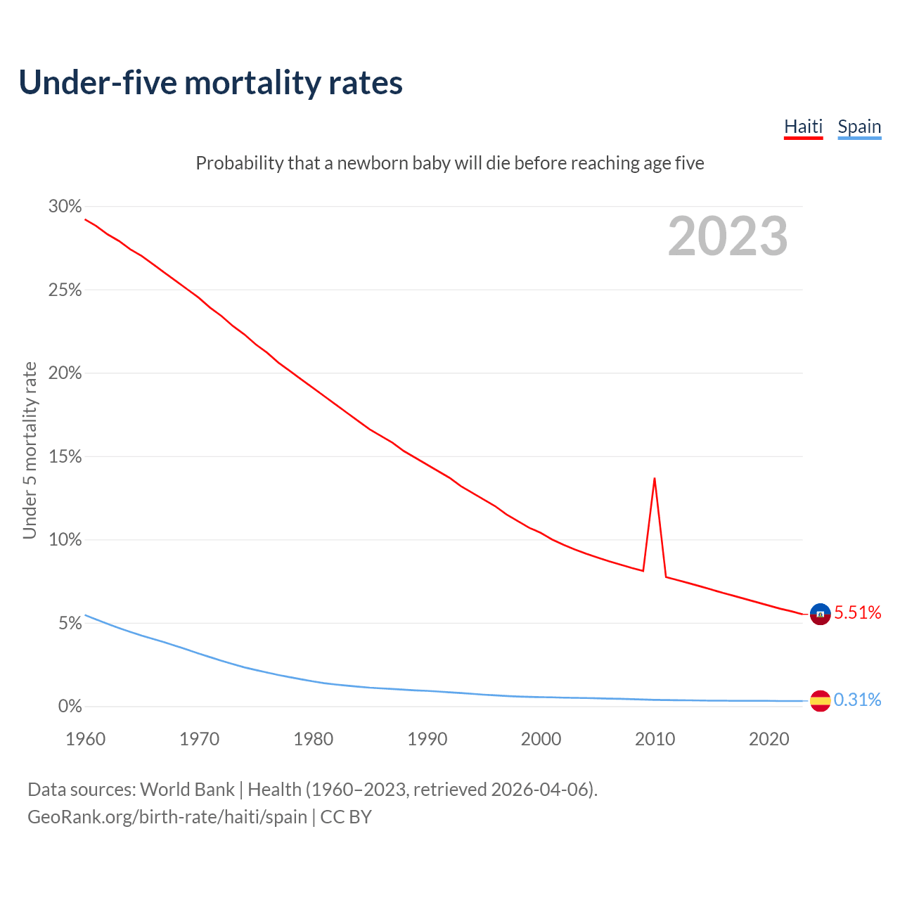 The chance that a newborn baby will die before reaching age five is 5.51% in Haiti and 0.31% in Spain. Above is a chart with historical data on under-five mortality rates.