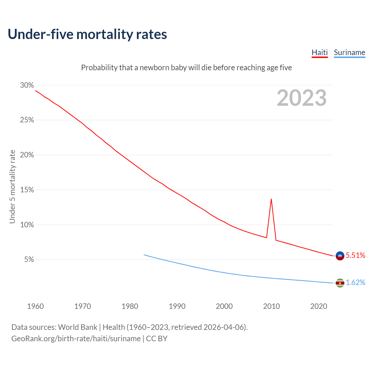 The chance that a newborn baby will die before reaching age five is 5.51% in Haiti and 1.62% in Suriname. Above is a chart with historical data on under-five mortality rates.