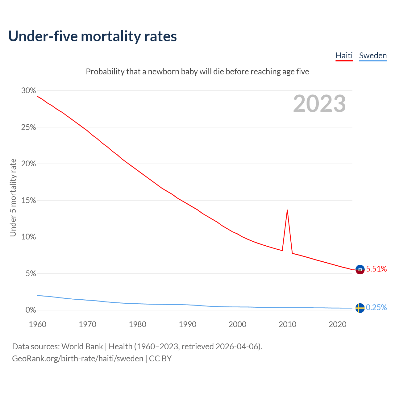 The chance that a newborn baby will die before reaching age five is 5.51% in Haiti and 0.25% in Sweden. Above is a chart with historical data on under-five mortality rates.