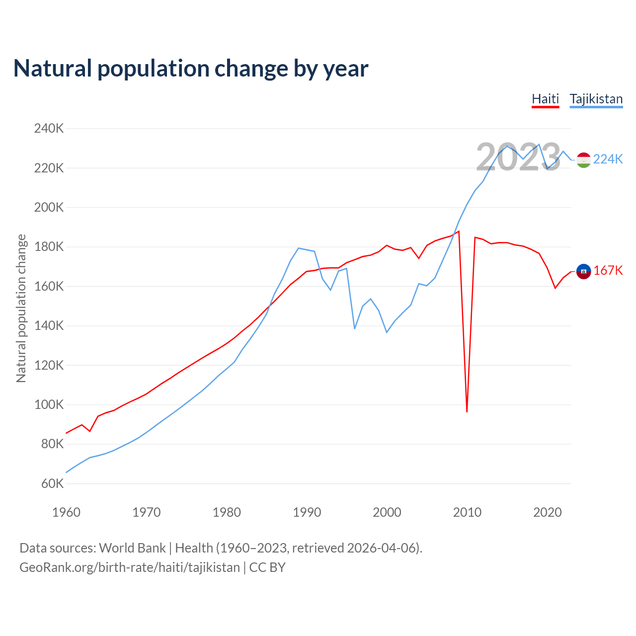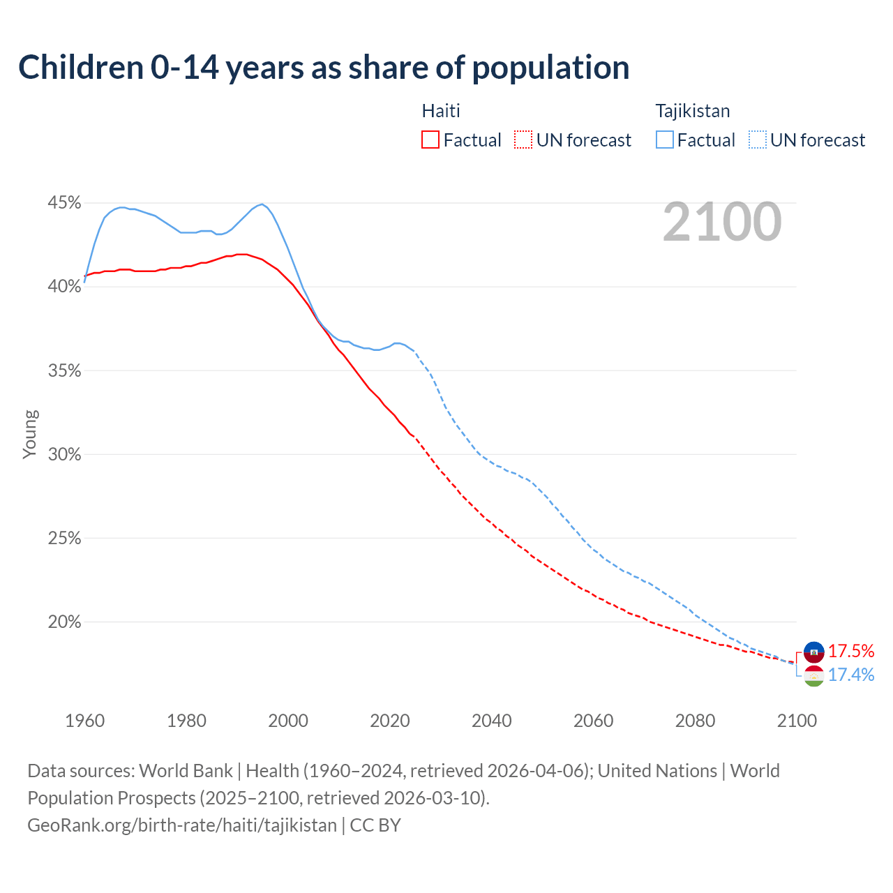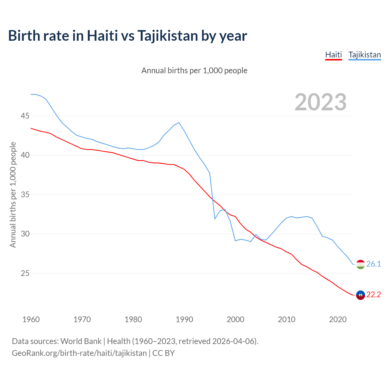 According to the latest available data on birth rates, the fertility rate in Haiti was 2.66 children per woman in 2023, compared to 3.07 in Tajikistan in 2023. The replacement level is considered to be 2.1 children per woman.