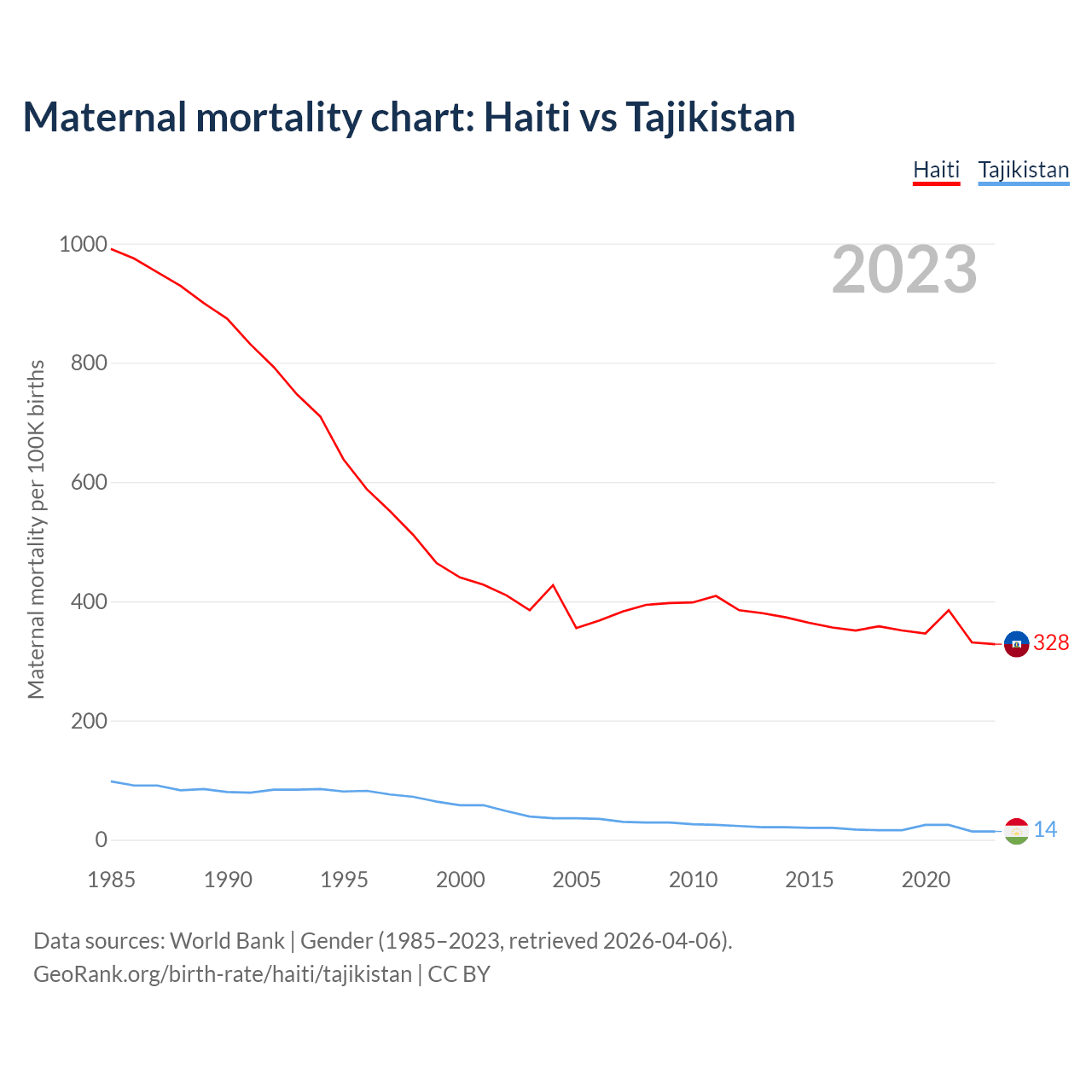 The maternal mortality rate, which is the probability of dying during childbirth or within 42 days of pregnancy termination, is 328 deaths per 100,000 live births in Haiti, compared to 14 deaths in Tajikistan.