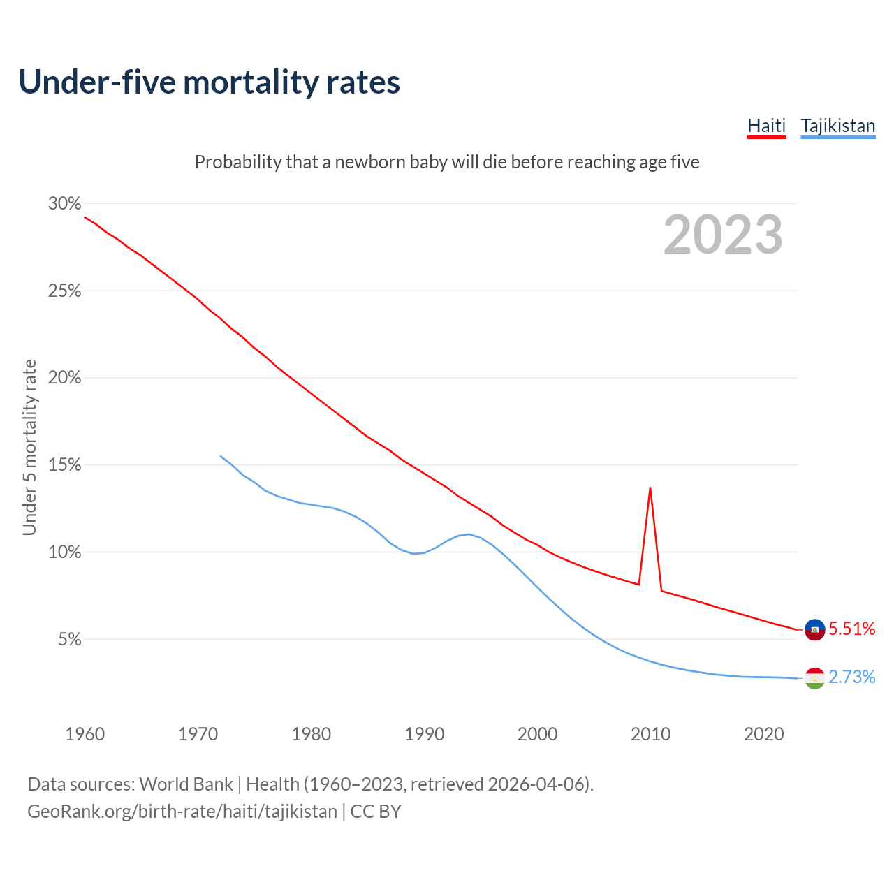 The chance that a newborn baby will die before reaching age five is 5.51% in Haiti and 2.73% in Tajikistan. Above is a chart with historical data on under-five mortality rates.