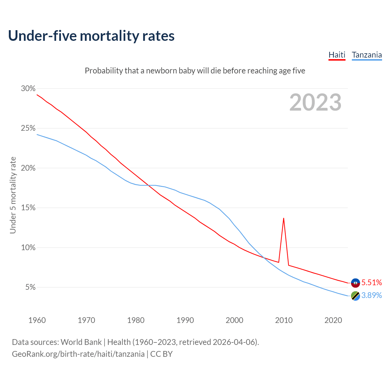 The chance that a newborn baby will die before reaching age five is 5.51% in Haiti and 3.89% in Tanzania. Above is a chart with historical data on under-five mortality rates.