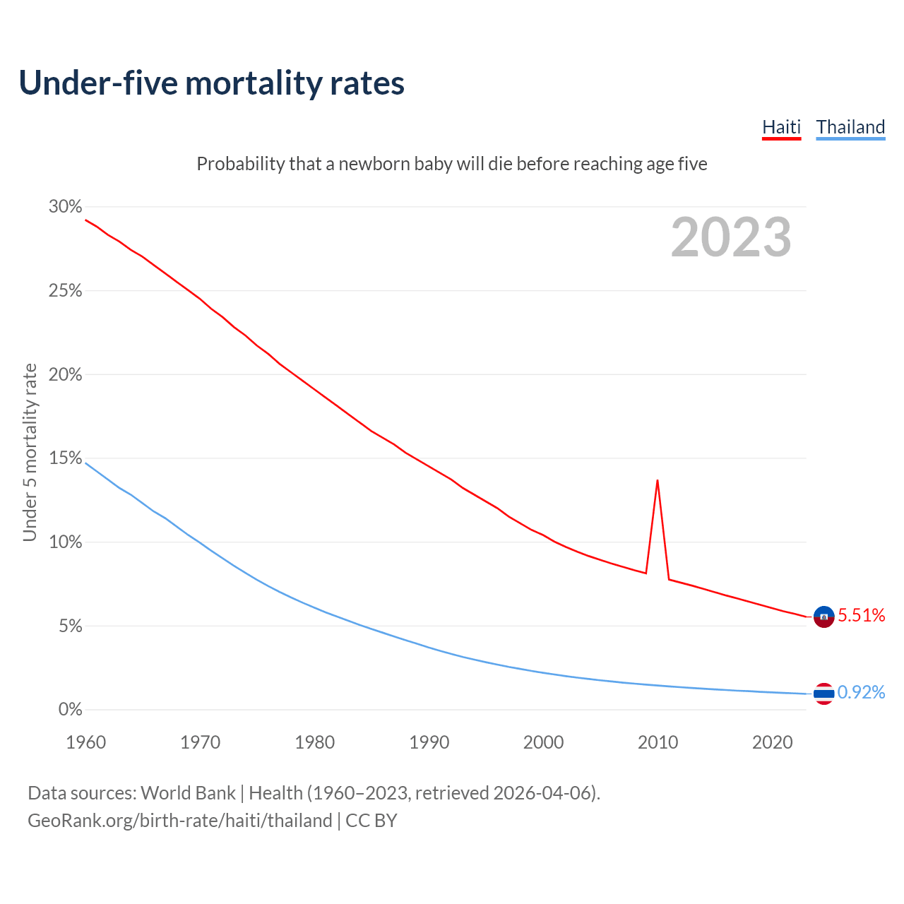 The chance that a newborn baby will die before reaching age five is 5.51% in Haiti and 0.92% in Thailand. Above is a chart with historical data on under-five mortality rates.
