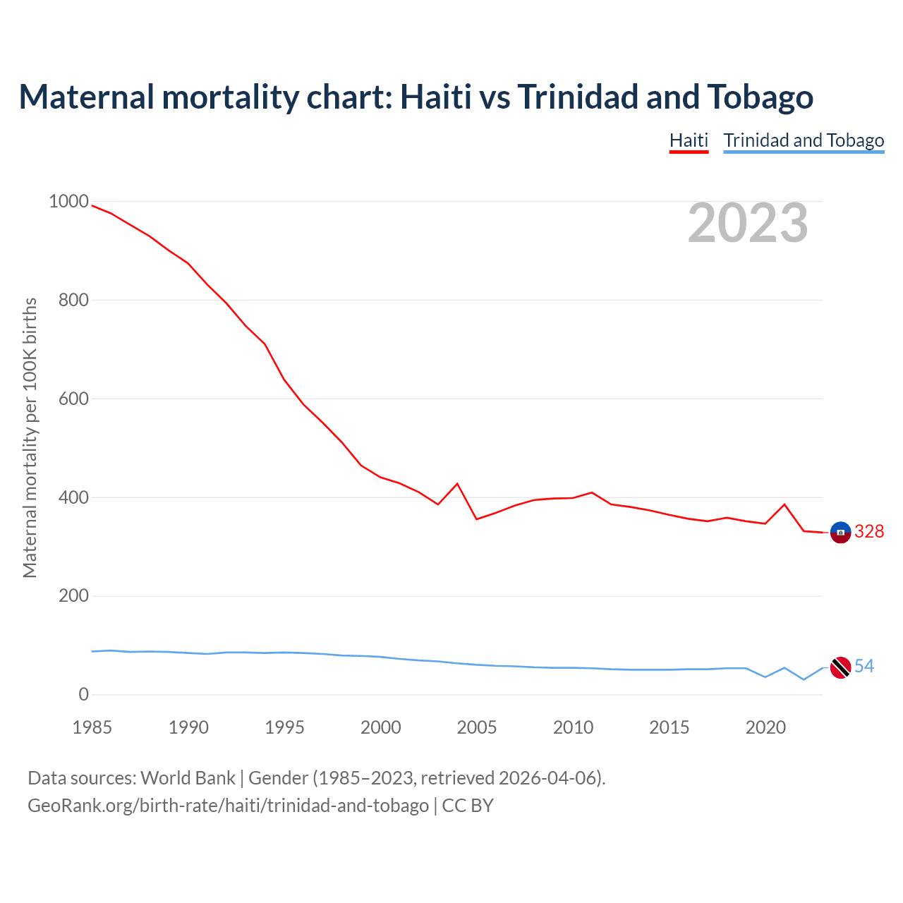 The maternal mortality rate, which is the probability of dying during childbirth or within 42 days of pregnancy termination, is 328 deaths per 100,000 live births in Haiti, compared to 54 deaths in Trinidad and Tobago.