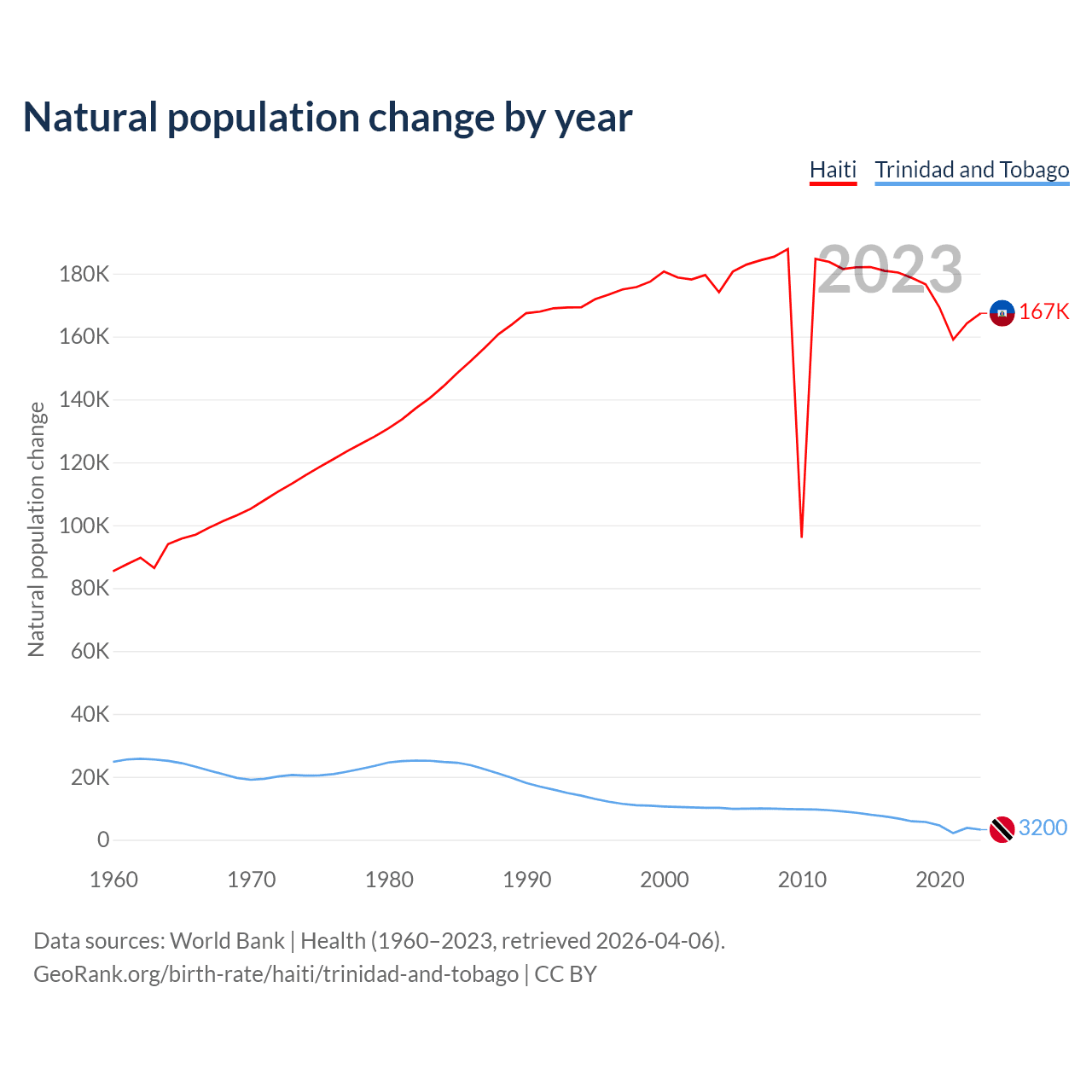 According to the latest available data on birth rates, the fertility rate in Haiti was 2.66 children per woman in 2023, compared to 1.53 in Trinidad and Tobago in 2023. The replacement level is considered to be 2.1 children per woman.