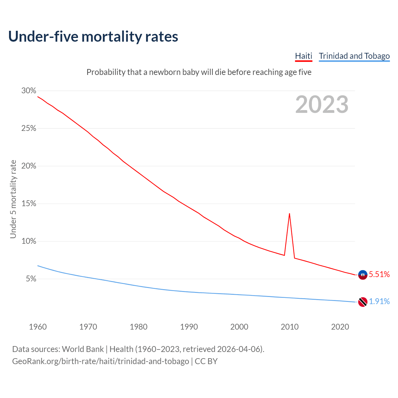 The chance that a newborn baby will die before reaching age five is 5.51% in Haiti and 1.91% in Trinidad and Tobago. Above is a chart with historical data on under-five mortality rates.