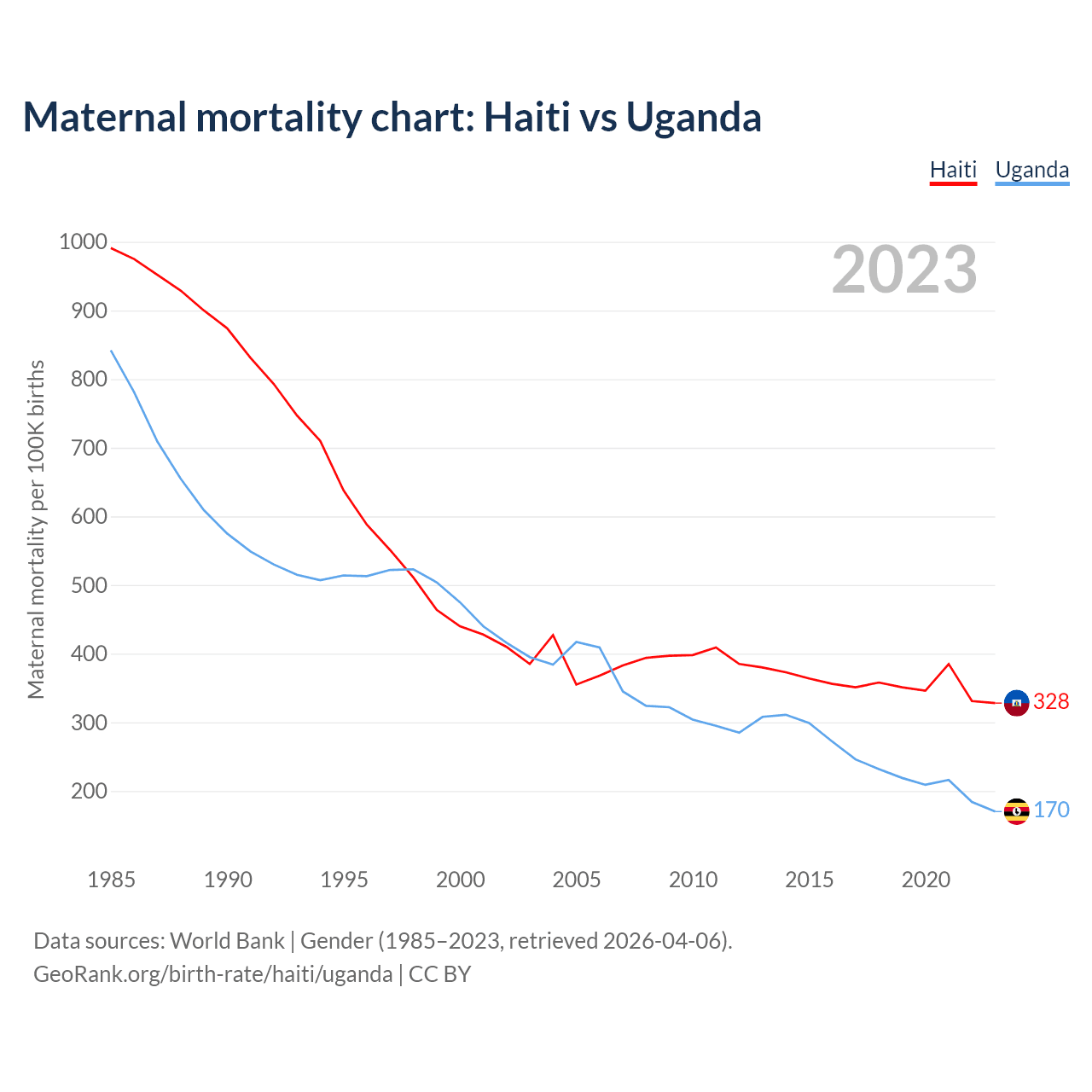The maternal mortality rate, which is the probability of dying during childbirth or within 42 days of pregnancy termination, is 328 deaths per 100,000 live births in Haiti, compared to 170 deaths in Uganda.