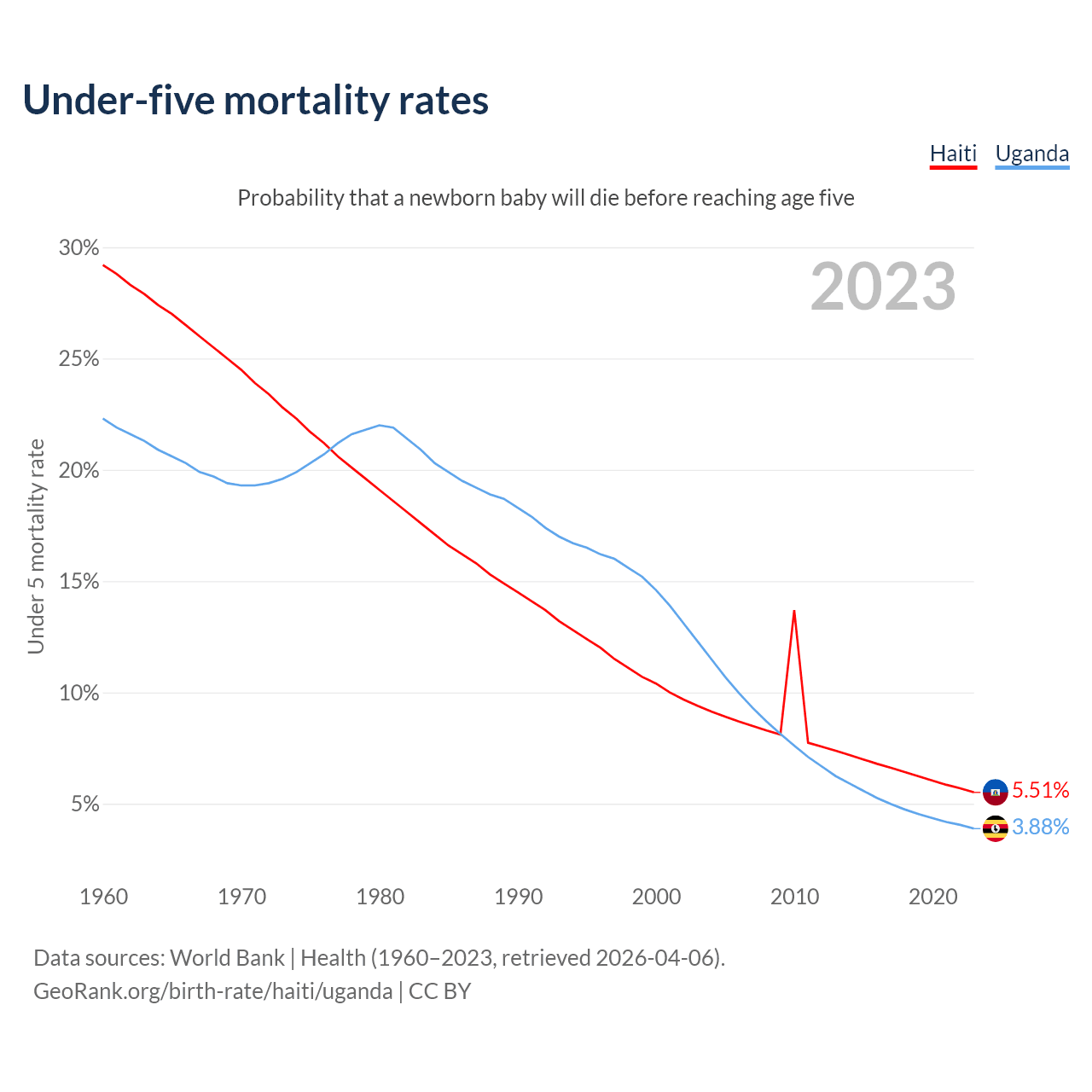 The chance that a newborn baby will die before reaching age five is 5.51% in Haiti and 3.88% in Uganda. Above is a chart with historical data on under-five mortality rates.