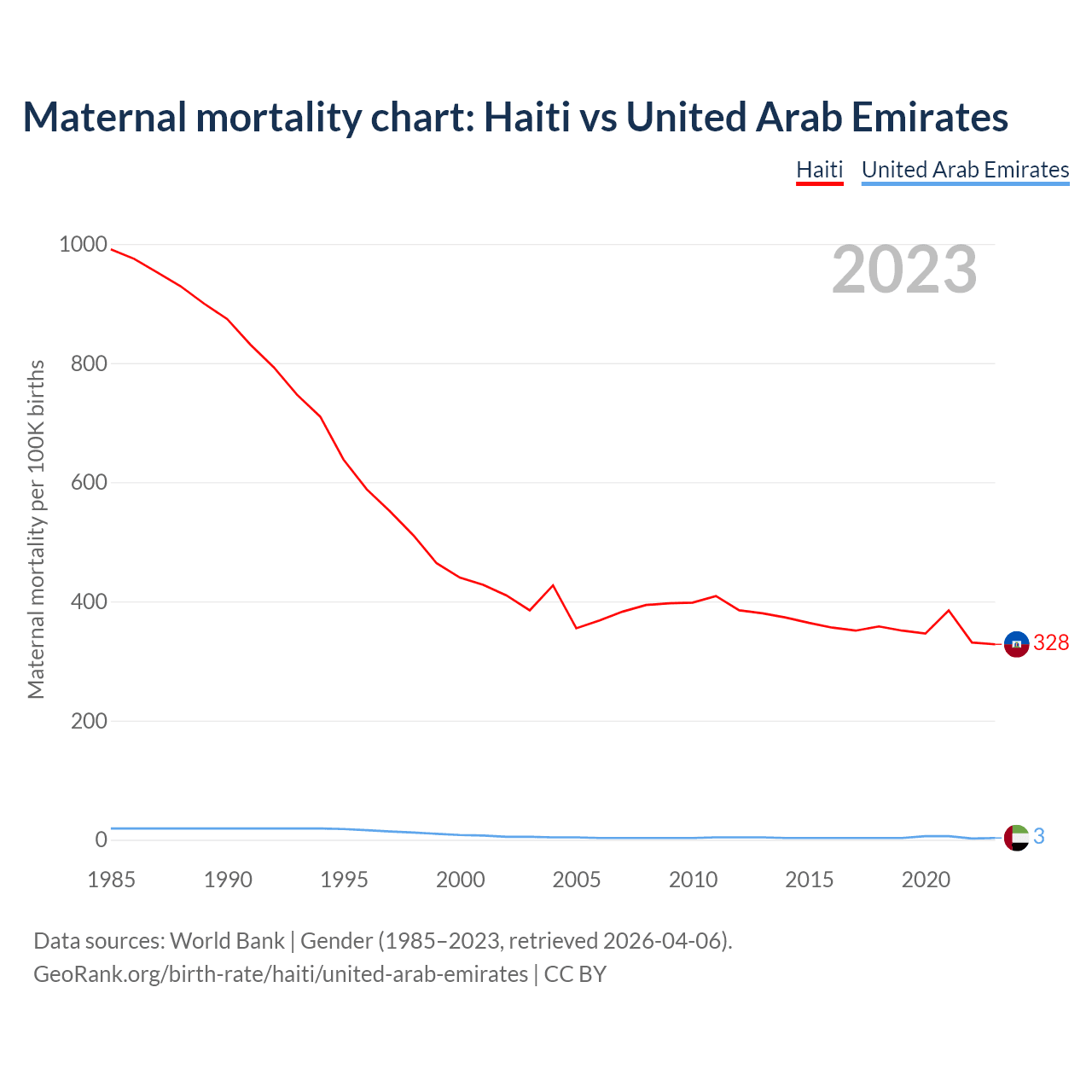 The maternal mortality rate, which is the probability of dying during childbirth or within 42 days of pregnancy termination, is 328 deaths per 100,000 live births in Haiti, compared to 3 deaths in the United Arab Emirates.