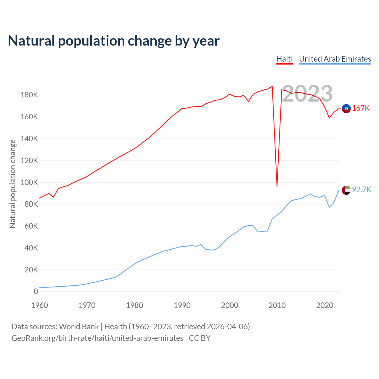 Haiti has an annual birth rate of 22.2 births per 1,000 people, compared to 9.77 for the United Arab Emirates. The average number of children a woman is expected to have during her lifetime — the fertility rate, is 2.66 in Haiti and 1.2 in the United Arab Emirates — 54.8% difference.