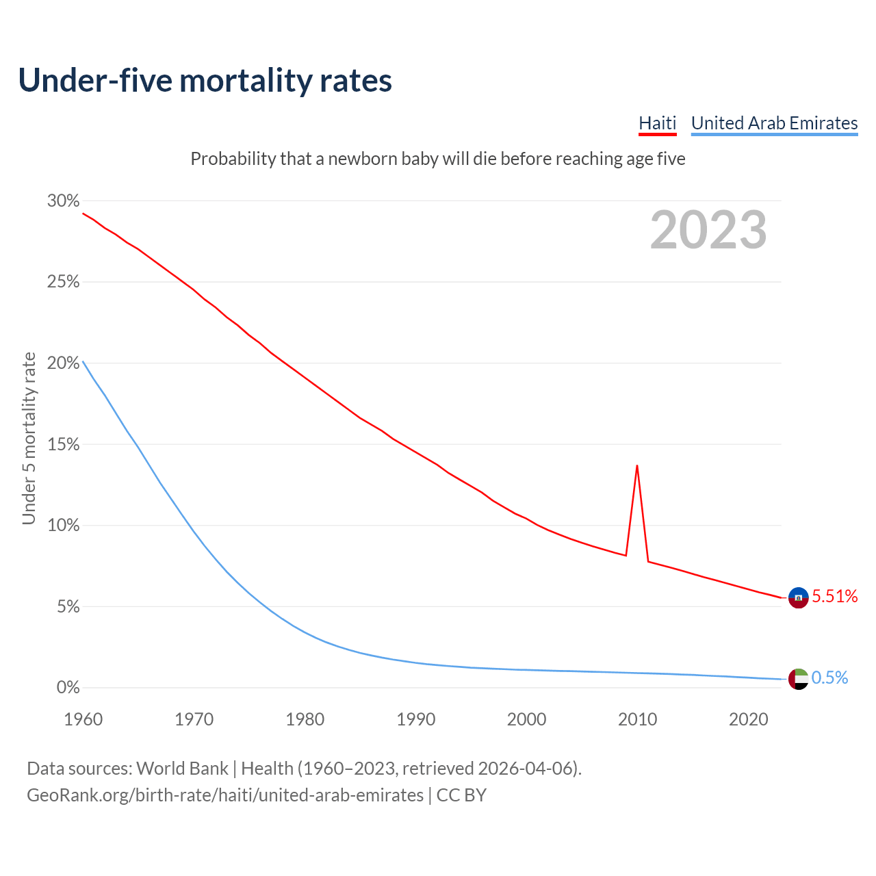 The chance that a newborn baby will die before reaching age five is 5.51% in Haiti and 0.5% in the United Arab Emirates. Above is a chart with historical data on under-five mortality rates.