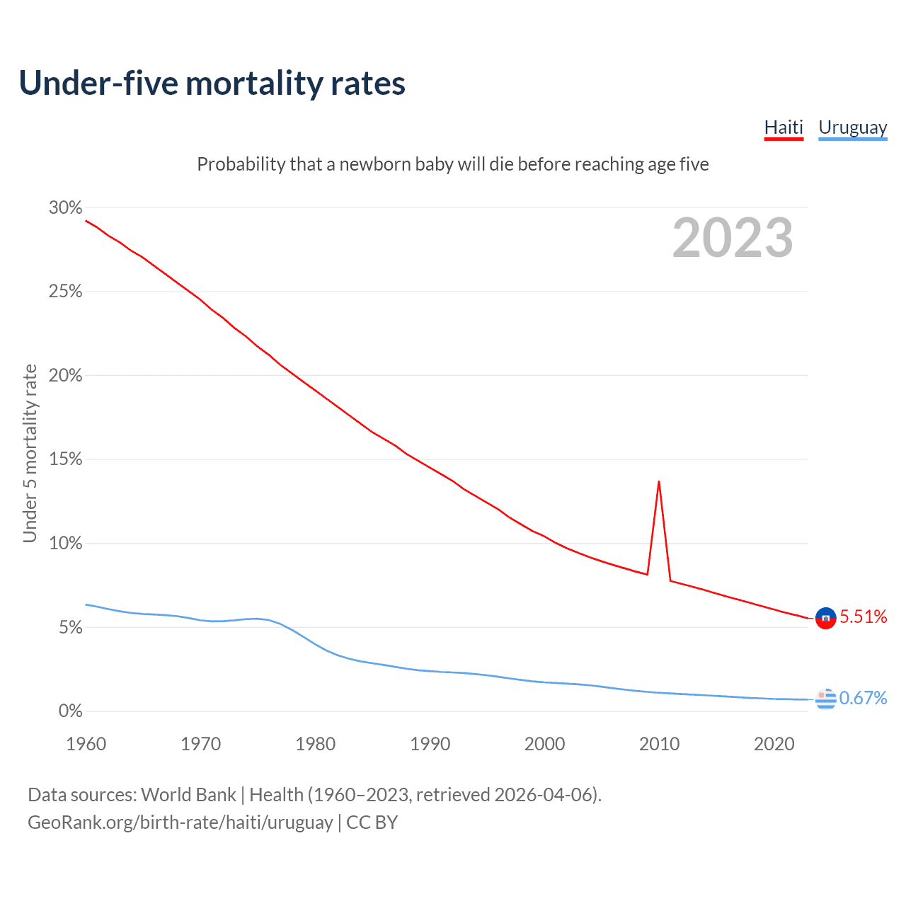 The chance that a newborn baby will die before reaching age five is 5.51% in Haiti and 0.67% in Uruguay. Above is a chart with historical data on under-five mortality rates.