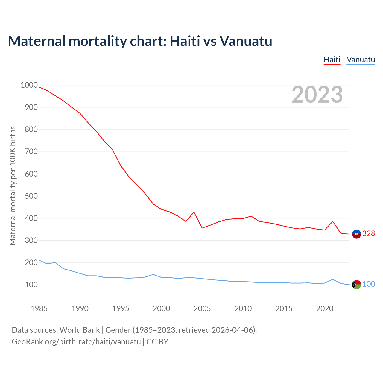The maternal mortality rate, which is the probability of dying during childbirth or within 42 days of pregnancy termination, is 328 deaths per 100,000 live births in Haiti, compared to 100 deaths in Vanuatu.