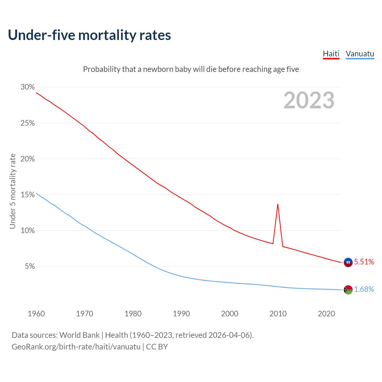 The chance that a newborn baby will die before reaching age five is 5.51% in Haiti and 1.68% in Vanuatu. Above is a chart with historical data on under-five mortality rates.