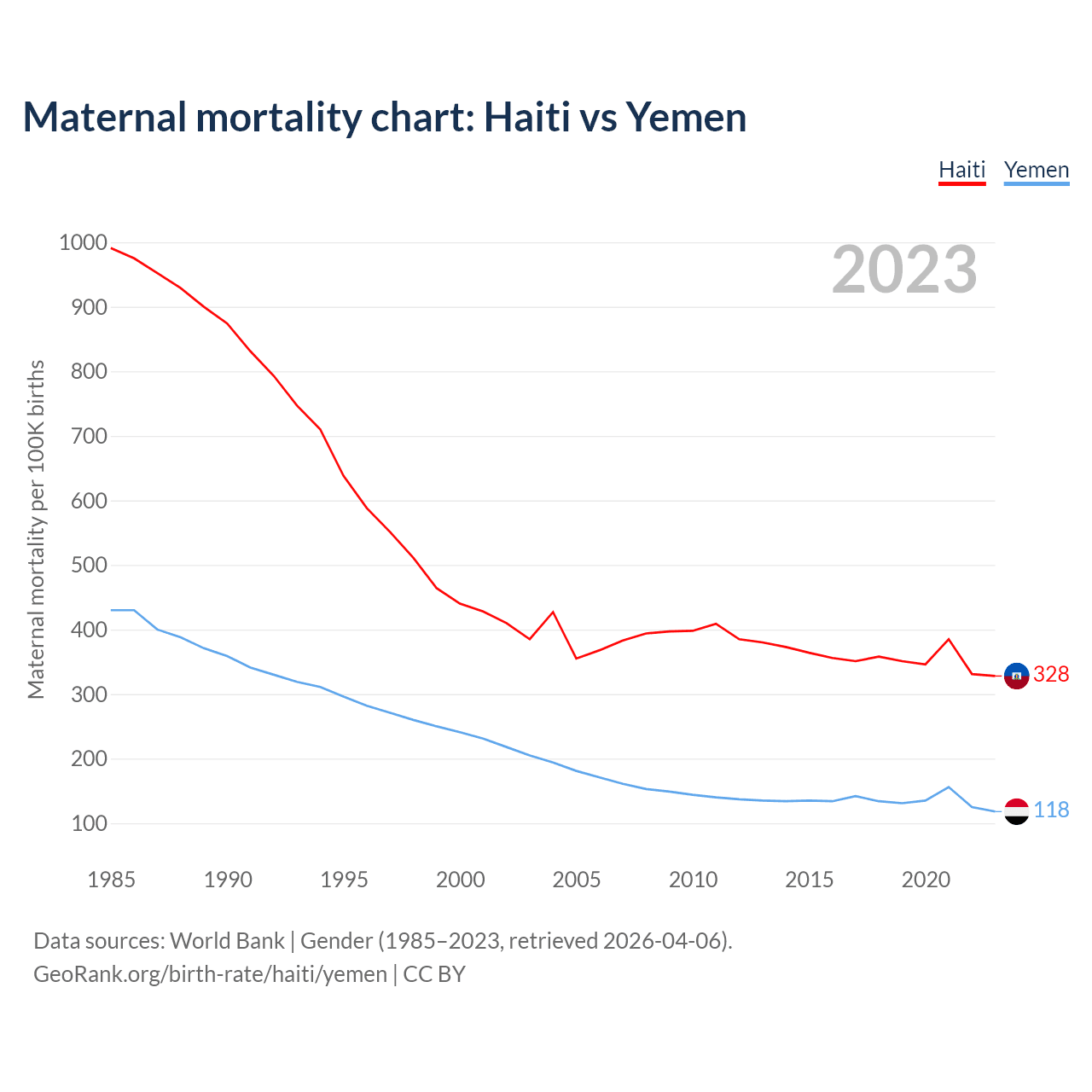 The maternal mortality rate, which is the probability of dying during childbirth or within 42 days of pregnancy termination, is 328 deaths per 100,000 live births in Haiti, compared to 118 deaths in Yemen.