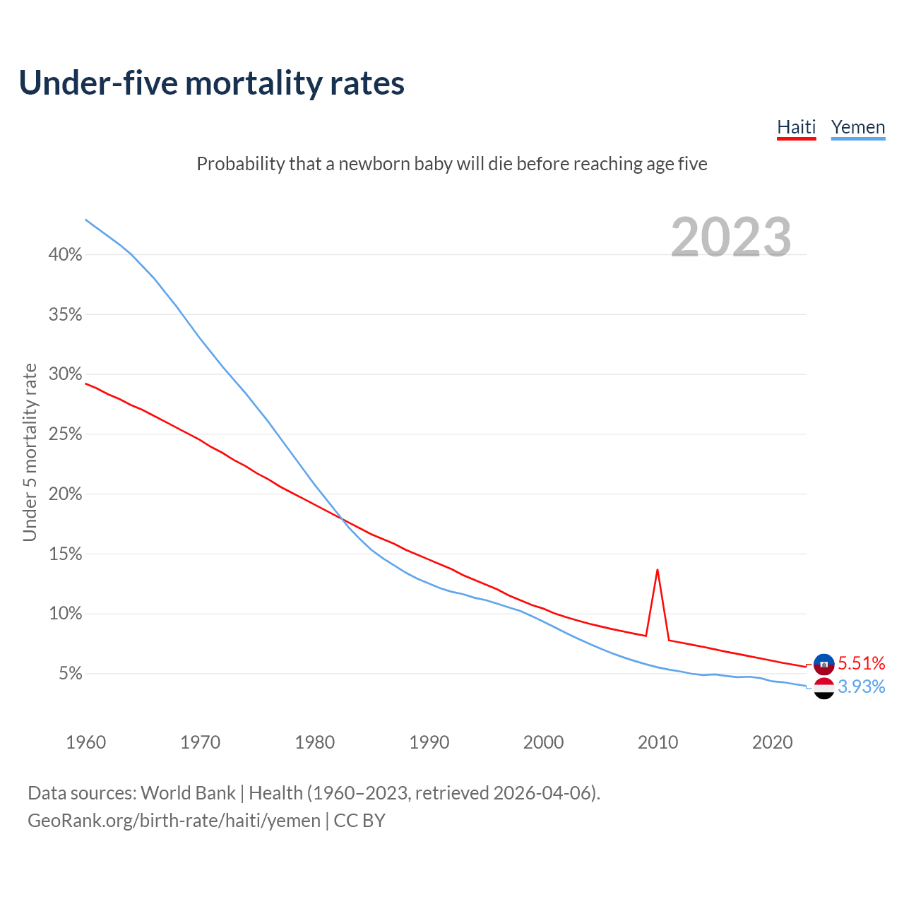 The chance that a newborn baby will die before reaching age five is 5.51% in Haiti and 3.93% in Yemen. Above is a chart with historical data on under-five mortality rates.